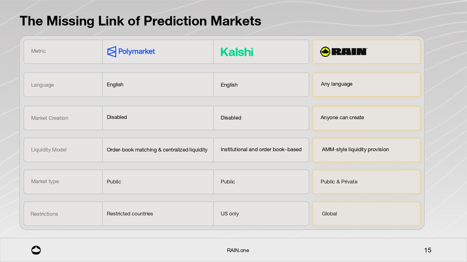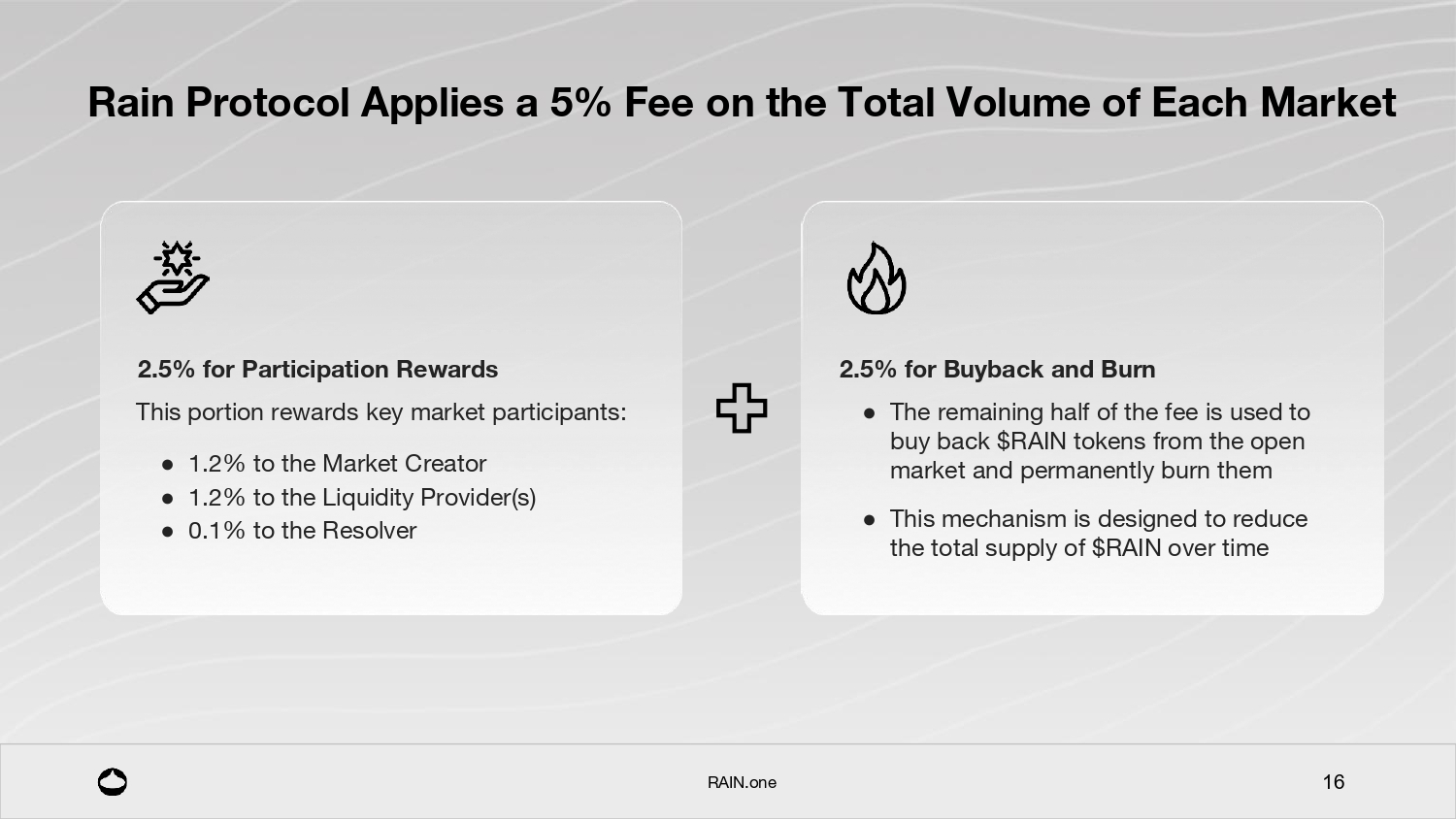 Metric The Missing Link of Prediction Markets Disabled Disabled Market Creation English English Language Public Public Market type US only Restricted countries Restrictions Anyone can create Any language Public & Private Global Institutional and order book – based Order - book matching & centralized liquidity Liquidity Model AMM - style liquidity provision RAIN.one 15 Rain Protocol Applies a 5% Fee on the Total Volume of Each Market 2.5% for Participation Rewards This portion rewards key market participants: ● 1.2% to the Market Creator ● 1.2% to the Liquidity Provider(s) ● 0.1% to the Resolver 2 . 5 % for Buyback and Burn ● The remaining half of the fee is used to buy back $ RAIN tokens from the open market and permanently burn them ● This mechanism is designed to reduce the total supply of $RAIN over time RAIN.one 16