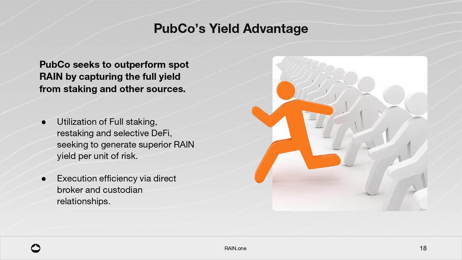 PubCo aims to drive shareholder value by becoming the largest corporate holder of RAIN and activating it for yield. PubCo will accelerate institutional adoption of RAIN as it becomes at the center of global prediction markets. RAIN.one 17 PubCo’s Yield Advantage PubCo seeks to outperform spot RAIN by capturing the full yield from staking and other sources.