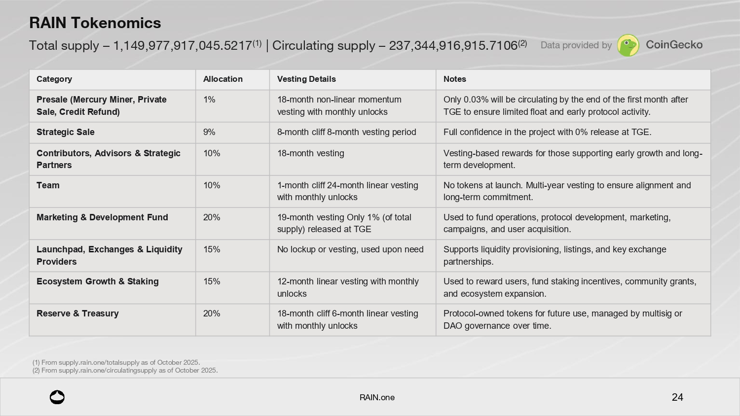 Notes Vesting Details Allocation Category Only 0.03% will be circulating by the end of the first month after TGE to ensure limited float and early protocol activity. 18 - month non - linear momentum vesting with monthly unlocks 1% Presale (Mercury Miner, Private Sale, Credit Refund) Full confidence in the project with 0% release at TGE. 8 - month cliff 8 - month vesting period 9% Strategic Sale Vesting - based rewards for those supporting early growth and long - term development. 18 - month vesting 10% Contributors, Advisors & Strategic Partners No tokens at launch. Multi - year vesting to ensure alignment and long - term commitment. 1 - month cliff 24 - month linear vesting with monthly unlocks 10% Team Used to fund operations, protocol development, marketing, campaigns, and user acquisition. 19 - month vesting Only 1% (of total supply) released at TGE 20% Marketing & Development Fund Supports liquidity provisioning, listings, and key exchange partnerships. No lockup or vesting, used upon need 15% Launchpad, Exchanges & Liquidity Providers Used to reward users, fund staking incentives, community grants, and ecosystem expansion. 12 - month linear vesting with monthly unlocks 15% Ecosystem Growth & Staking Protocol - owned tokens for future use, managed by multisig or DAO governance over time. 18 - month cliff 6 - month linear vesting with monthly unlocks 20% Reserve & Treasury RAIN Tokenomics Total supply – 1,149,977,917,045.5217 (1) | Circulating supply – 237,344,916,915.7106 (2) Data provided by (1) From supply.rain.one/totalsupply as of October 2025. (2) From supply.rain.one/circulatingsupply as of October 2025. RAIN.one 24 THE RAIN OPPORTUNITY DAT Strategy 1.