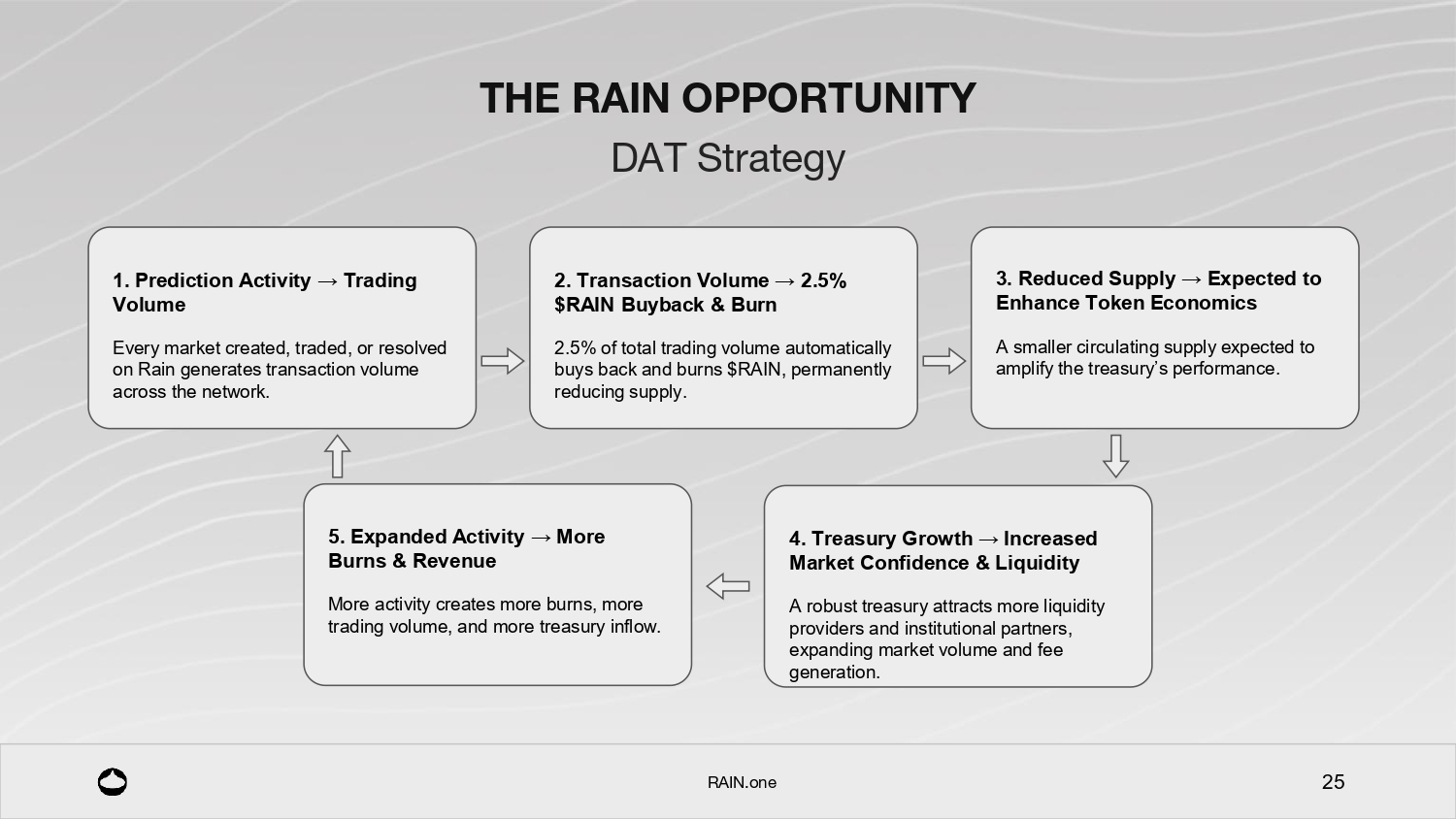 Prediction Activity → Trading Volume Every market created, traded, or resolved on Rain generates transaction volume across the network. 2. Transaction Volume → 2.5% $RAIN Buyback & Burn 2 . 5 % of total trading volume automatically buys back and burns $ RAIN, permanently reducing supply . 3. Reduced Supply → Expected to Enhance Token Economics A smaller circulating supply expected to amplify the treasury’s performance. 5. Expanded Activity → More Burns & Revenue More activity creates more burns, more trading volume, and more treasury inflow. 4. Treasury Growth → Increased Market Confidence & Liquidity A robust treasury attracts more liquidity providers and institutional partners, expanding market volume and fee generation.
