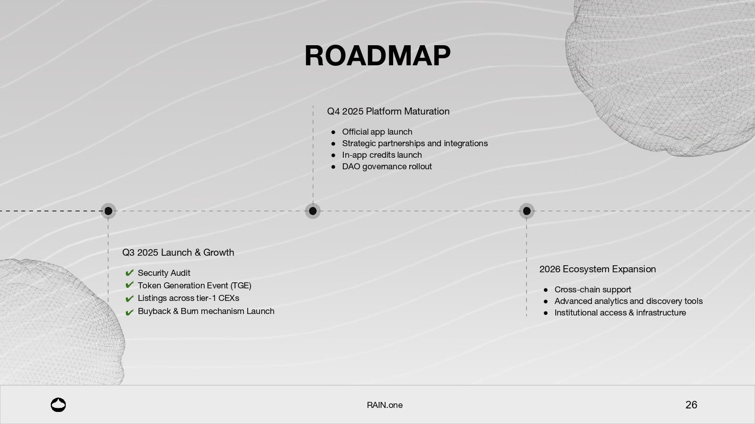 RAIN.one 25 ROADMAP Q4 2025 Platform Maturation ● Official app launch ● Strategic partnerships and integrations ● In - app credits launch ● DAO governance rollout Q3 2025 Launch & Growth Security Audit Token Generation Event (TGE) Listings across tier - 1 CEXs Buyback & Burn mechanism Launch 2026 Ecosystem Expansion ● Cross - chain support ● Advanced analytics and discovery tools ● Institutional access & infrastructure RAIN.on e 26 RAIN.one