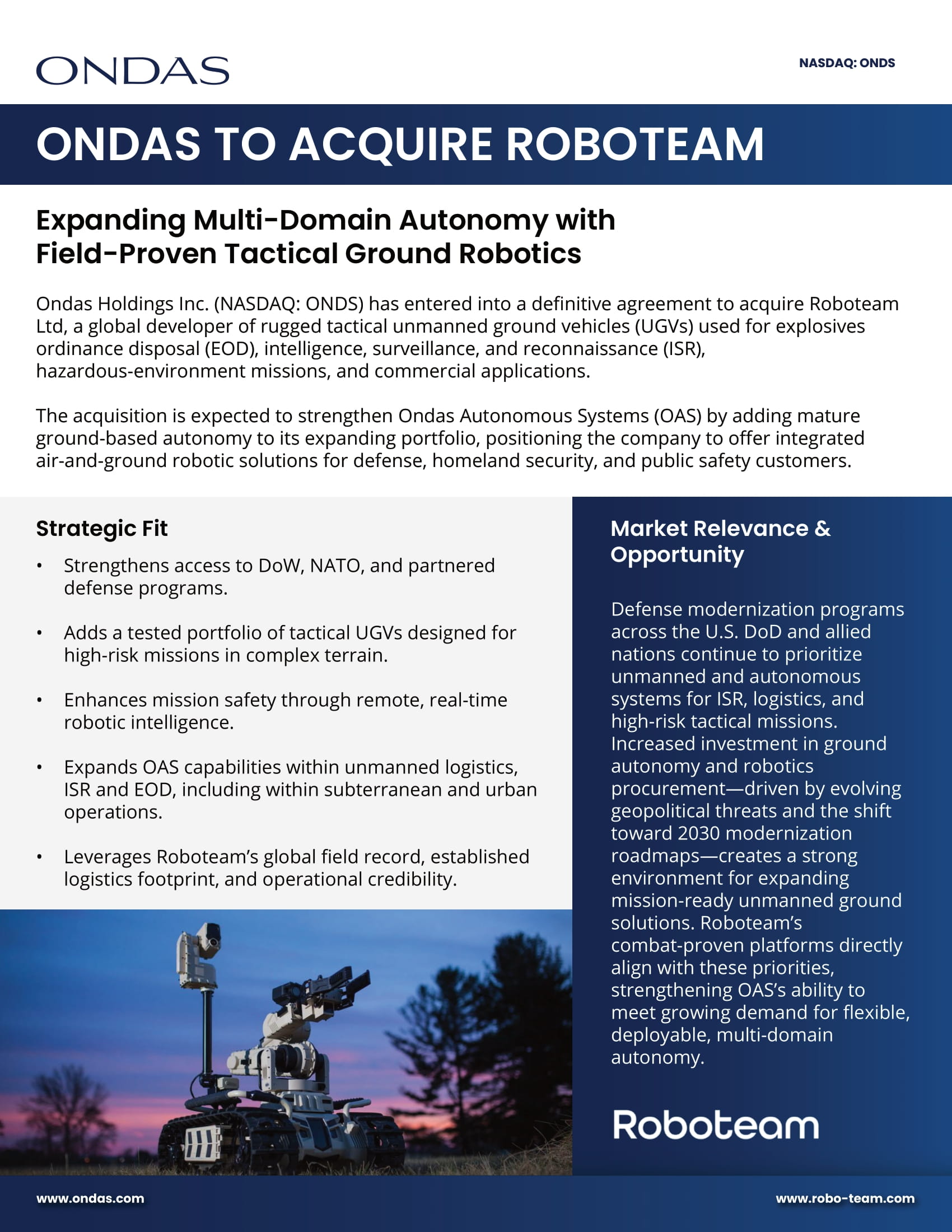 NASDAQ: ONDS Expanding Multi - Domain Autonomy with Field - Proven Tactical Ground Robotics Ondas Holdings Inc. (NASDAQ: ONDS) has entered into a definitive agreement to acquire Roboteam Ltd, a global developer of rugged tactical unmanned ground vehicles (UGVs) used for explosives ordinance disposal (EOD), intelligence, surveillance, and reconnaissance (ISR), hazardous - environment missions, and commercial applications. The acquisition is expected to strengthen Ondas Autonomous Systems (OAS) by adding mature ground - based autonomy to its expanding portfolio, positioning the company to offer integrated air - and - ground robotic solutions for defense, homeland security, and public safety customers . ONDAS TO ACQUIRE ROBOTEAM • Strengthens access to DoW, NATO, and partnered defense programs. • Adds a tested portfolio of tactical UGVs designed for high - risk missions in complex terrain. • Enhances mission safety through remote, real - time robotic intelligence. • Expands OAS capabilities within unmanned logistics, ISR and EOD, including within subterranean and urban operations. • Leverages Roboteam’s global field record, established logistics footprint, and operational credibility. Strategic Fit Defense modernization programs across the U.S. DoD and allied nations continue to prioritize unmanned and autonomous systems for ISR, logistics, and high - risk tactical missions. Increased investment in ground autonomy and robotics procurement — driven by evolving geopolitical threats and the shift toward 2030 modernization roadmaps — creates a strong environment for expanding mission - ready unmanned ground solutions. Roboteam’s combat - proven platforms directly align with these priorities, strengthening OAS’s ability to meet growing demand for flexible, deployable, multi - domain autonomy. Market Relevance & Opportunity www.ondas.com www.robo - team.com These elements demonstrate a deliberate integration strategy that enhances capability while reducing complexity, supporting OAS’s long - term roadmap for scalable multi - domain autonomy.