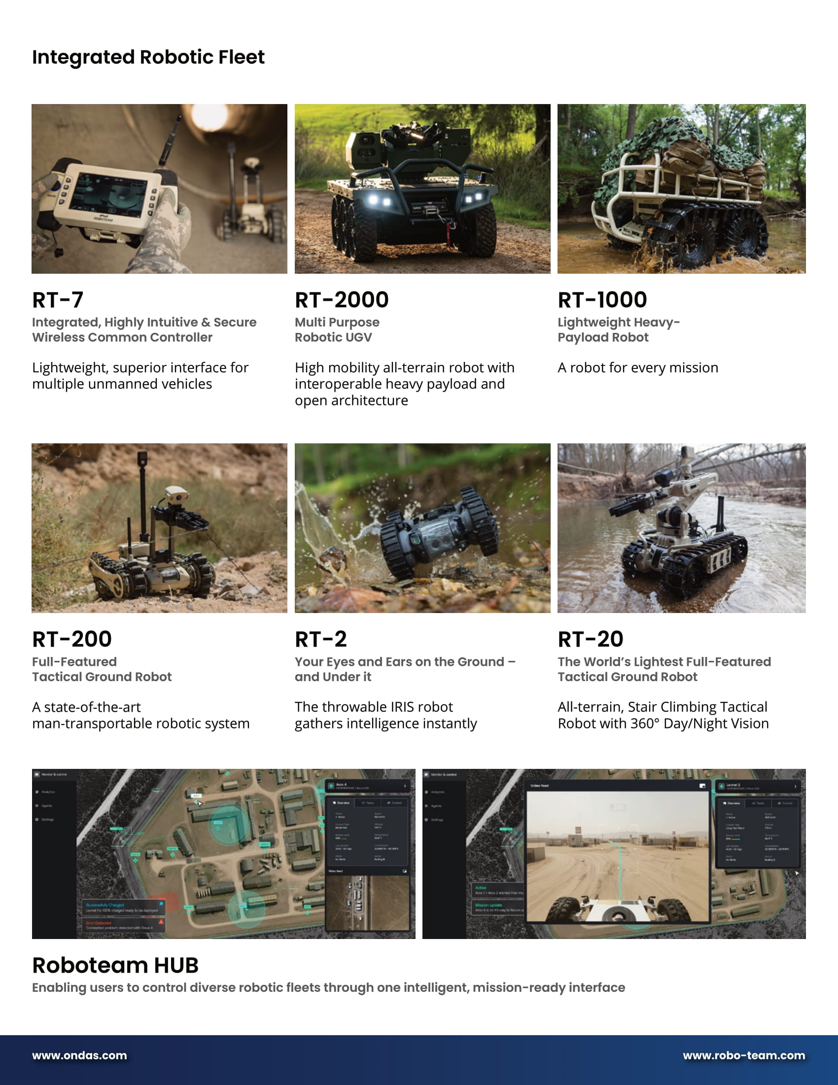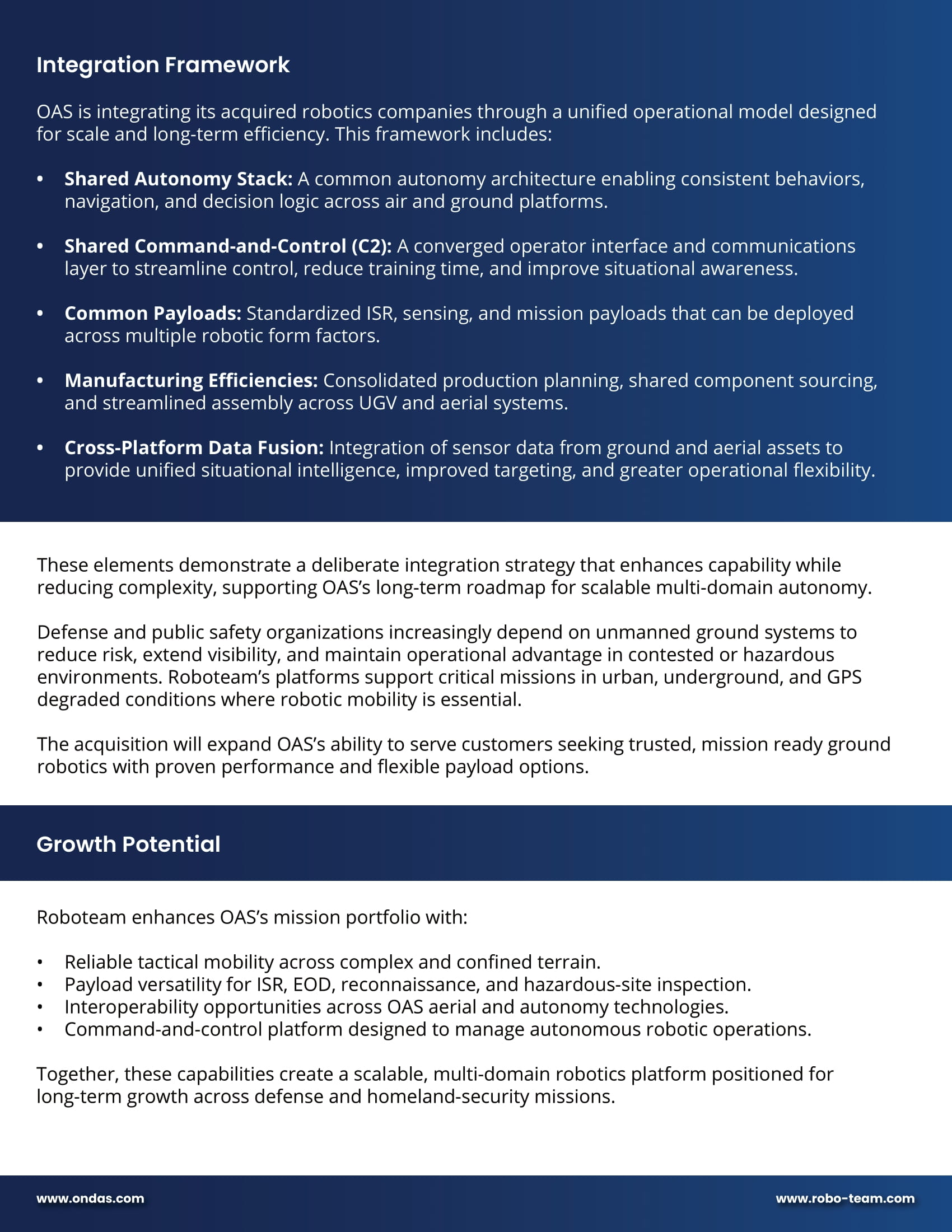 Defense and public safety organizations increasingly depend on unmanned ground systems to reduce risk, extend visibility, and maintain operational advantage in contested or hazardous environments. Roboteam’s platforms support critical missions in urban, underground, and GPS degraded conditions where robotic mobility is essential. The acquisition will expand OAS’s ability to serve customers seeking trusted, mission ready ground robotics with proven performance and flexible payload options. www.ondas.com www.robo - team.com Integration Framework OAS is integrating its acquired robotics companies through a unified operational model designed for scale and long - term efficiency. This framework includes: • Shared Autonomy Stack: A common autonomy architecture enabling consistent behaviors, navigation, and decision logic across air and ground platforms. • Shared Command - and - Control (C2): A converged operator interface and communications layer to streamline control, reduce training time, and improve situational awareness. • Common Payloads: Standardized ISR, sensing, and mission payloads that can be deployed across multiple robotic form factors. • Manufacturing Efficiencies: Consolidated production planning, shared component sourcing, and streamlined assembly across UGV and aerial systems. • Cross - Platform Data Fusion: Integration of sensor data from ground and aerial assets to provide unified situational intelligence, improved targeting, and greater operational flexibility. Growth Potential Roboteam enhances OAS’s mission portfolio with: • Reliable tactical mobility across complex and confined terrain. • Payload versatility for ISR, EOD, reconnaissance, and hazardous - site inspection. • Interoperability opportunities across OAS aerial and autonomy technologies. • Command - and - control platform designed to manage autonomous robotic operations. Together, these capabilities create a scalable, multi - domain robotics platform positioned for long - term growth across defense and homeland - security missions.