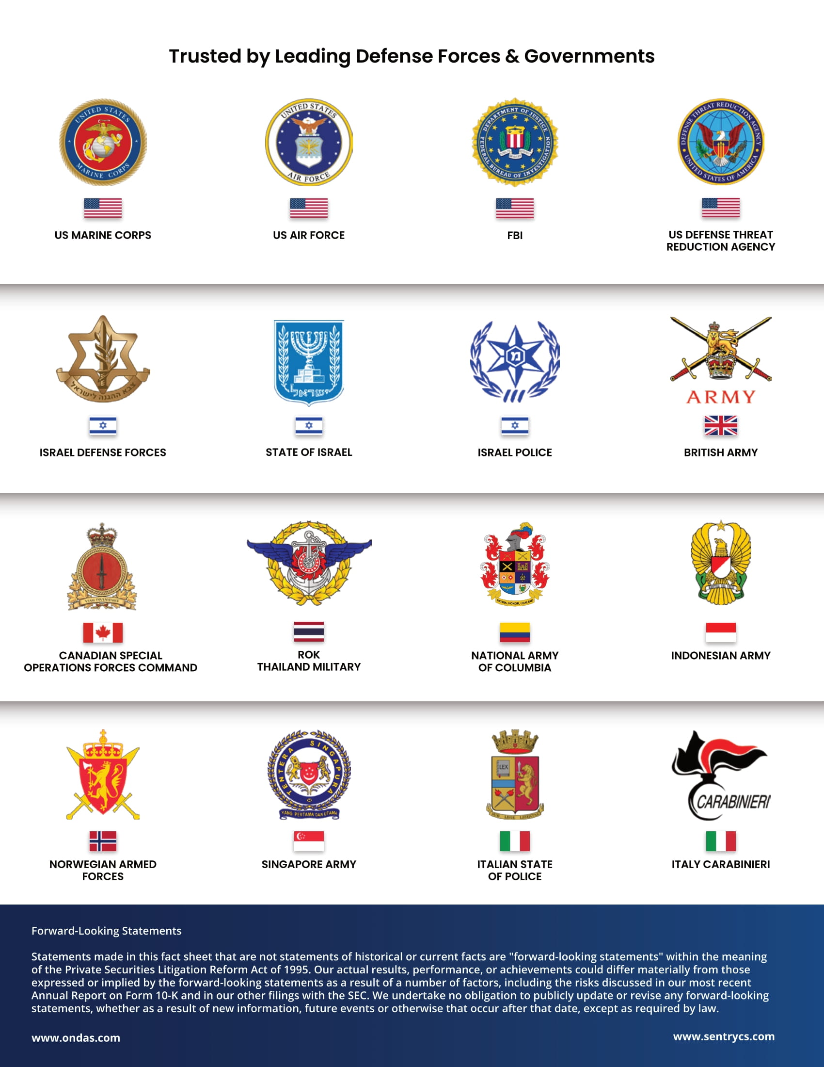Our actual results, performance, or achievements could differ materially from those expressed or implied by the forward - looking statements as a result of a number of factors, including the risks discussed in our most recent Annual Report on Form 10 - K and in our other filings with the SEC. We undertake no obligation to publicly update or revise any forward - looking statements, whether as a result of new information, future events or otherwise that occur after that date, except as required by law. www.sentrycs.com www.ondas.com Trusted by Leading Defense Forces & Governments CANADIAN SPECIAL OPERATIONS FORCES COMMAND ROK THAILAND MILITARY NATIONAL ARMY OF COLUMBIA INDONESIAN ARMY US MARINE CORPS US AIR FORCE FBI US DEFENSE THREAT REDUCTION AGENCY ISRAEL DEFENSE FORCES STATE OF ISRAEL ISRAEL POLICE BRITISH ARMY NORWEGIAN ARMED FORCES SINGAPORE ARMY ITALIAN STATE OF POLICE ITALY CARABINIERI