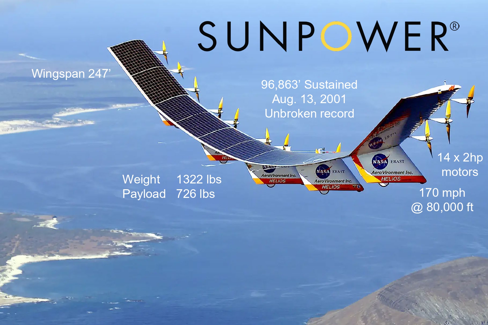 3 Wingspan 247’ Weight Payload 1322 lbs 726 lbs 96,863’ Sustained Aug. 13, 2001 Unbroken record 14 x 2hp motors 170 mph @ 80,000 ft
