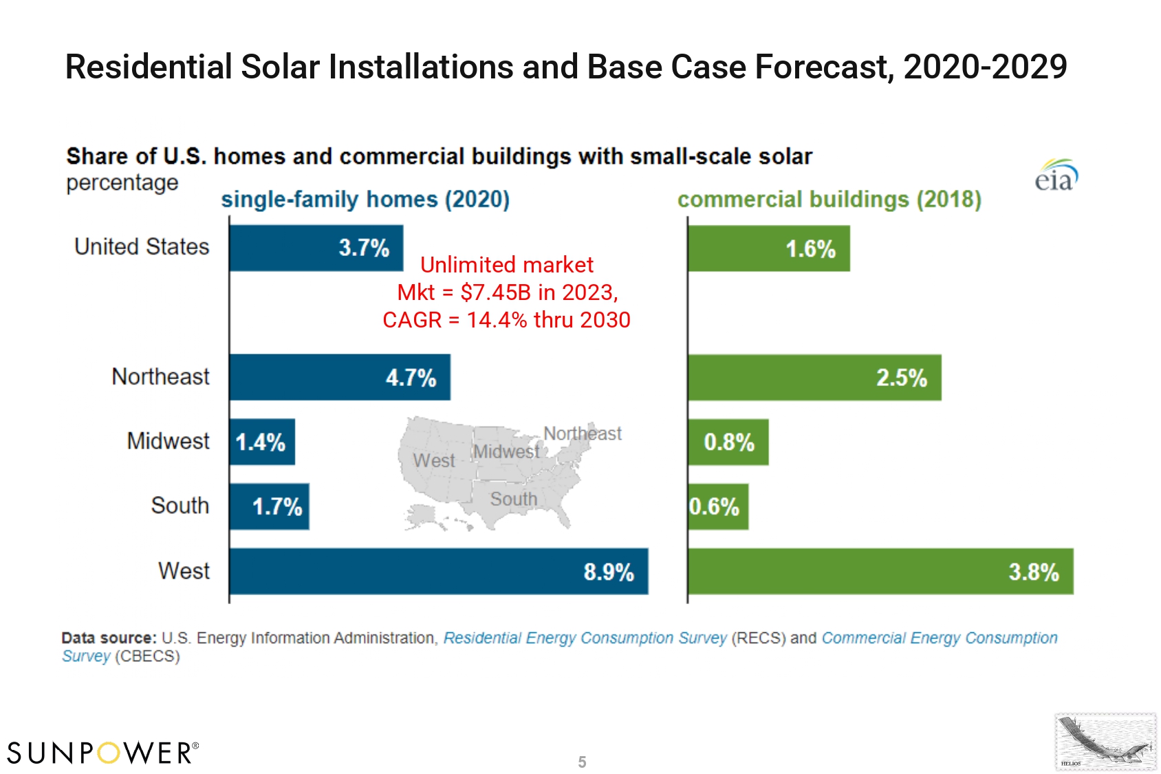 5 Residential Solar Installations and Base Case Forecast, 2020 - 2029 Unlimited market Mkt = $7.45B in 2023, CAGR = 14.4% thru 2030