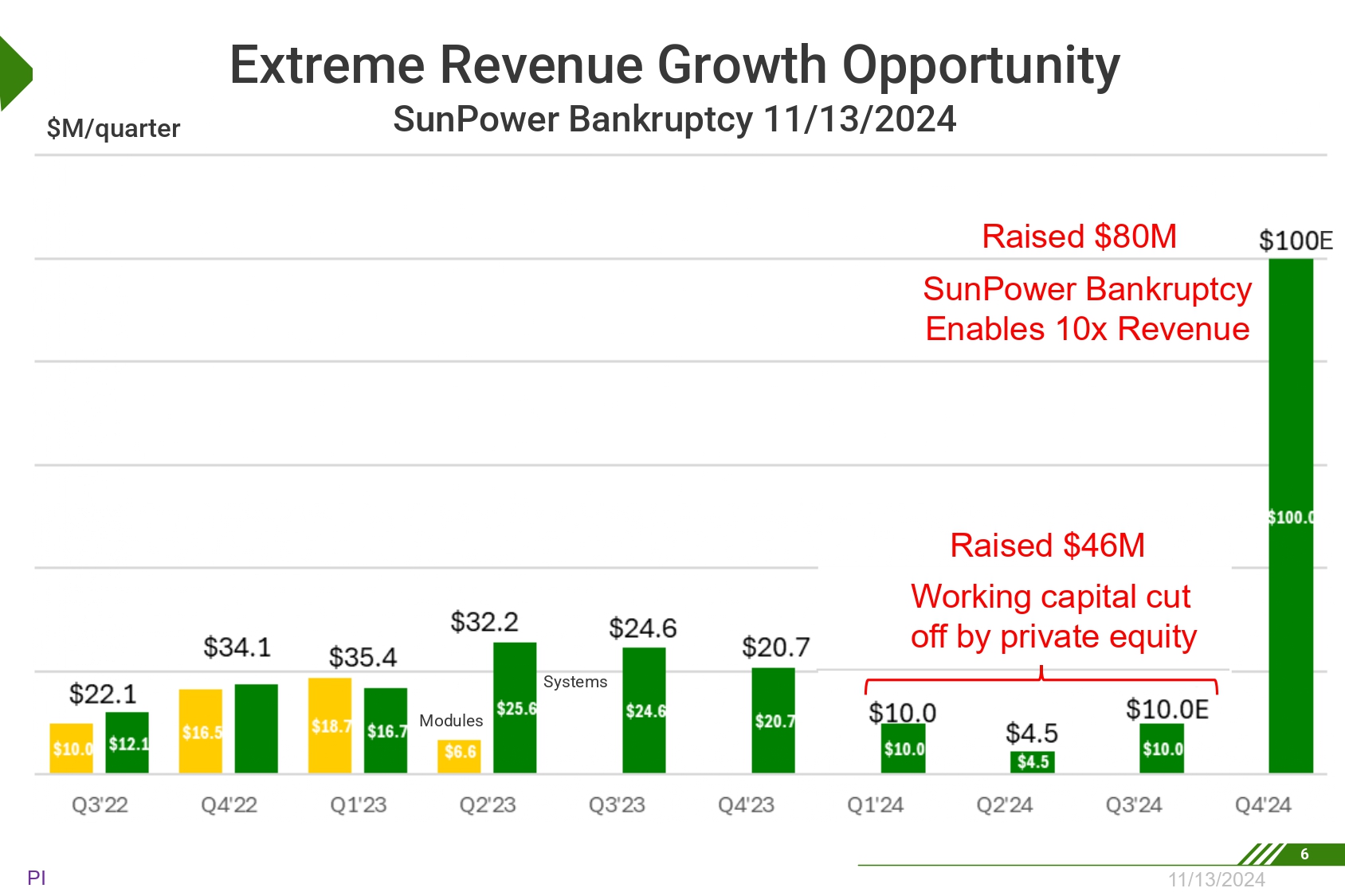 6 $M/quarter Systems Modules Extreme Revenue Growth Opportunity SunPower Bankruptcy 11/13/2024 11/13/2024 PI E Raised $80M SunPower Bankruptcy Enables 10x Revenue Raised $46M Working capital cut off by private equity