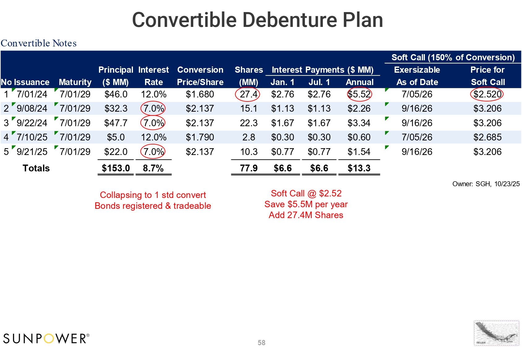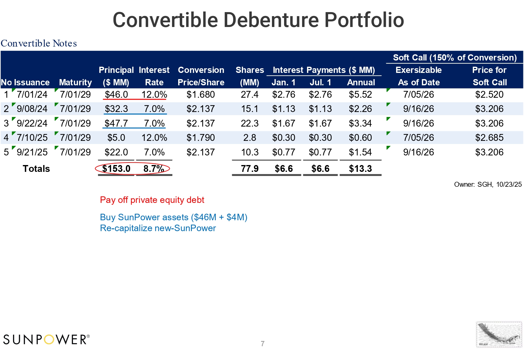 7 7 Convertible Debenture Portfolio Soft Call (150% of Conversion) Price for Exersizable Interest Payments ($ MM) Shares Conversion Principal Interest Soft Call As of Date Jan. 1 Jul. 1 Annual (MM) Price/Share ($ MM) Rate Maturity No Issuance $2.520 7/05/26 $5.52 $2.76 $2.76 27.4 $1.680 $46.0 12.0% 7/01/29 7/01/24 1 $3.206 9/16/26 $2.26 $1.13 $1.13 15.1 $2.137 $32.3 7.0% 7/01/29 9/08/24 2 $3.206 9/16/26 $3.34 $1.67 $1.67 22.3 $2.137 $47.7 7.0% 7/01/29 3 9/22/24 $2.685 7/05/26 $0.60 $0.30 $0.30 2.8 $1.790 12.0% $5.0 7/01/29 4 7/10/25 $3.206 9/16/26 $1.54 $0.77 $0.77 10.3 $2.137 7.0% $22.0 7/01/29 5 9/21/25 $13.3 $6.6 $6.6 77.9 8.7% $153.0 Totals Owner: SGH, 10/23/25 Convertible Notes Pay off private equity debt Buy SunPower assets ($46M + $4M) Re - capitalize new - SunPower