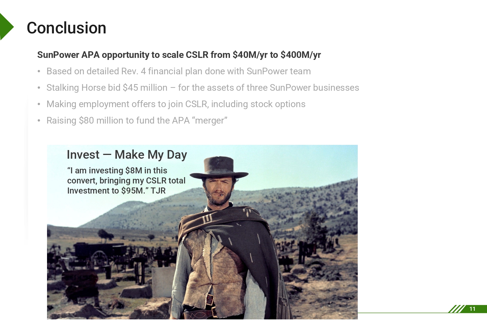 Conclusion 11 SunPower APA opportunity to scale CSLR from $40M/yr to $400M/yr • Based on detailed Rev. 4 financial plan done with SunPower team • Stalking Horse bid $45 million – for the assets of three SunPower businesses • Making employment offers to join CSLR, including stock options • Raising $80 million to fund the APA “merger” Invest — Make My Day “I am investing $8M in this convert, bringing my CSLR total Investment to $95M.” TJR