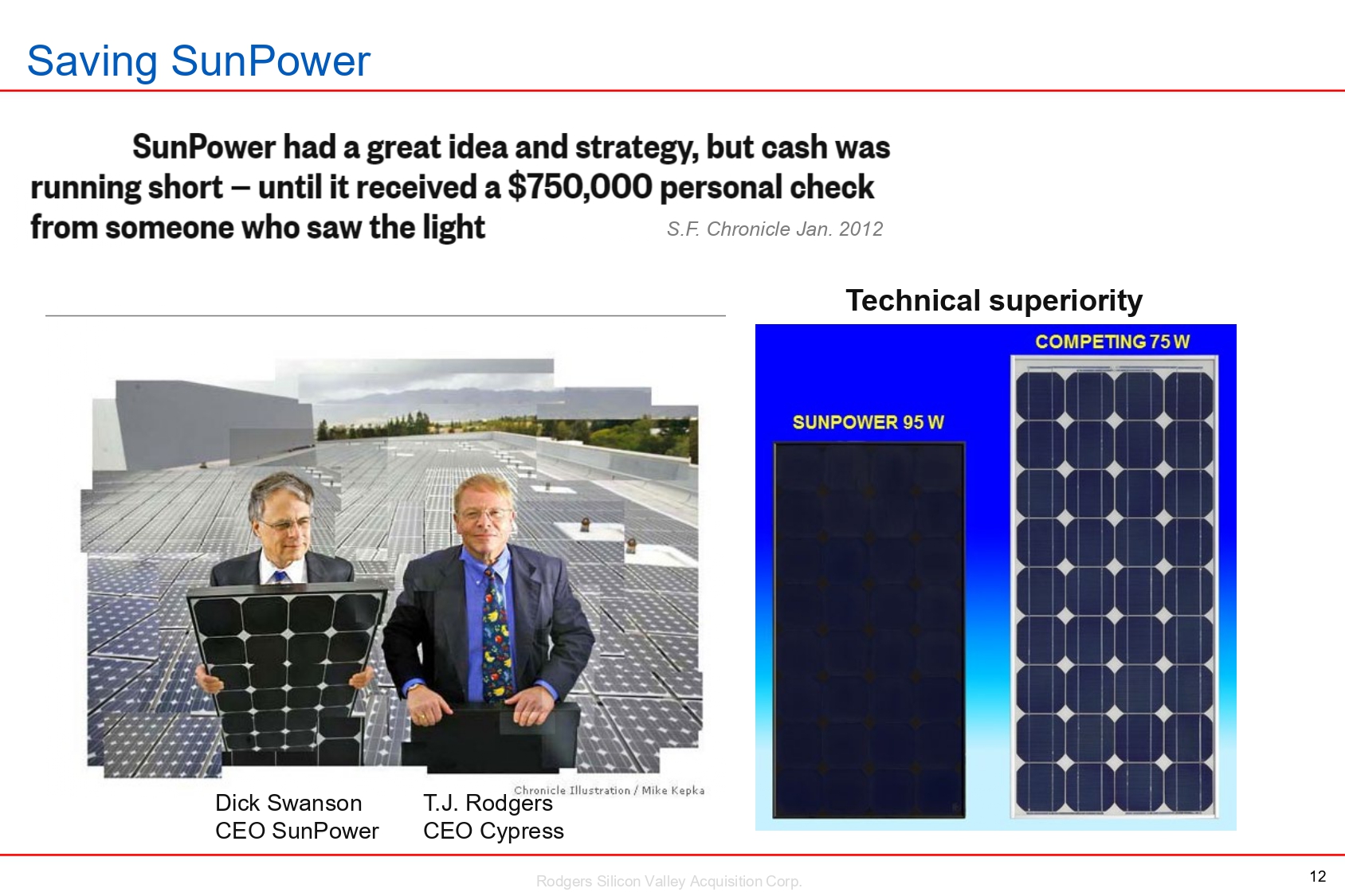 Saving SunPower Dick Swanson CEO SunPower T.J. Rodgers CEO Cypress S.F. Chronicle Jan. 2012 12 Rodgers Silicon Valley Acquisition Corp. Technical superiority