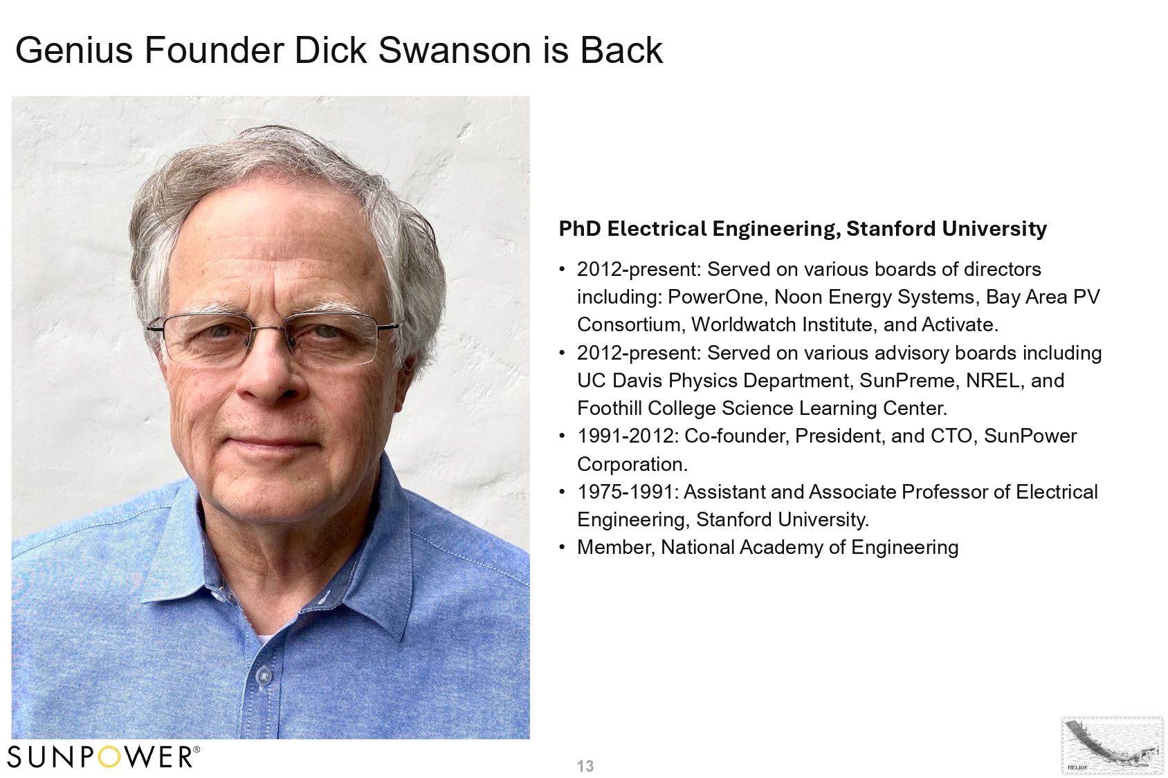 Genius Founder Dick Swanson is Back PhD Electrical Engineering, Stanford University • 2012 - present: Served on various boards of directors including: PowerOne, Noon Energy Systems, Bay Area PV Consortium, Worldwatch Institute, and Activate. • 2012 - present: Served on various advisory boards including UC Davis Physics Department, SunPreme, NREL, and Foothill College Science Learning Center. • 1991 - 2012: Co - founder, President, and CTO, SunPower Corporation. • 1975 - 1991: Assistant and Associate Professor of Electrical Engineering, Stanford University. • Member, National Academy of Engineering 13 13