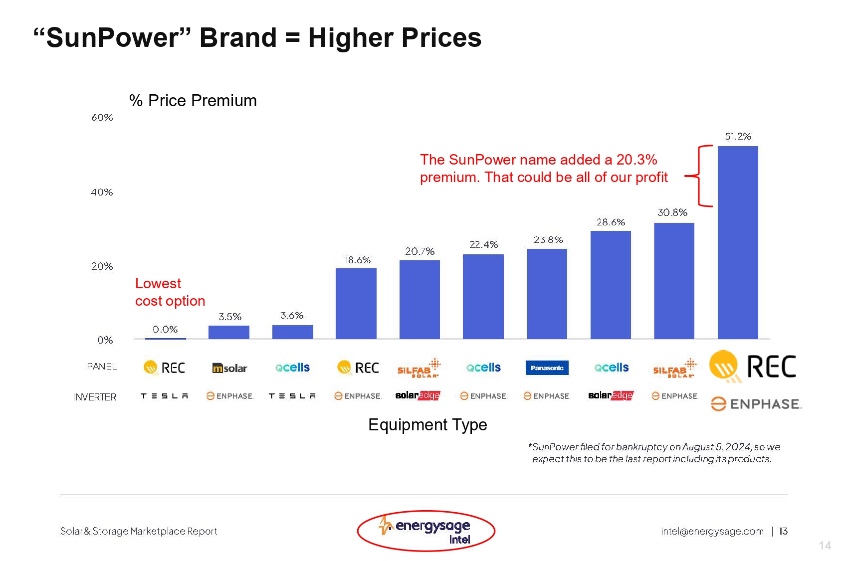 The SunPower name added a 20.3% premium. That could be all of our profit “SunPower” Brand = Higher Prices 14 Lowest cost option % Price Premium Equipment Type