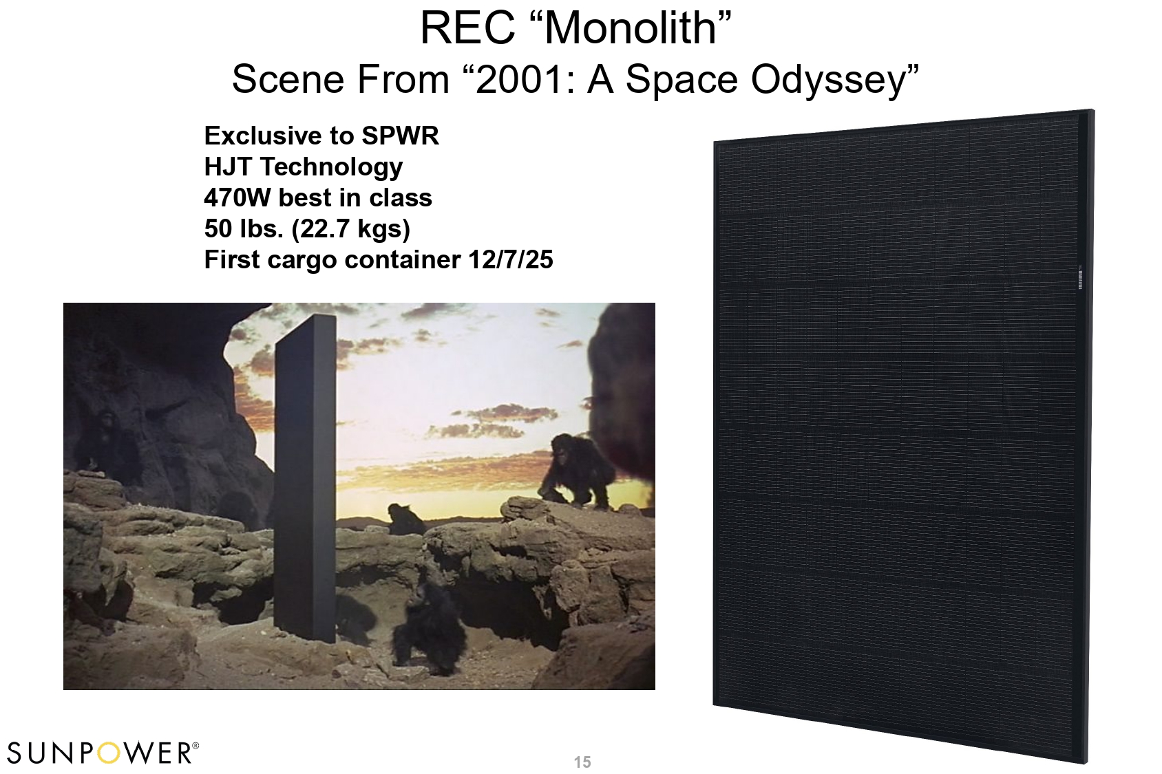 15 REC “Monolith” Scene From “2001: A Space Odyssey” Exclusive to SPWR HJT Technology 470W best in class 50 lbs. (22.7 kgs) First cargo container 12/7/25
