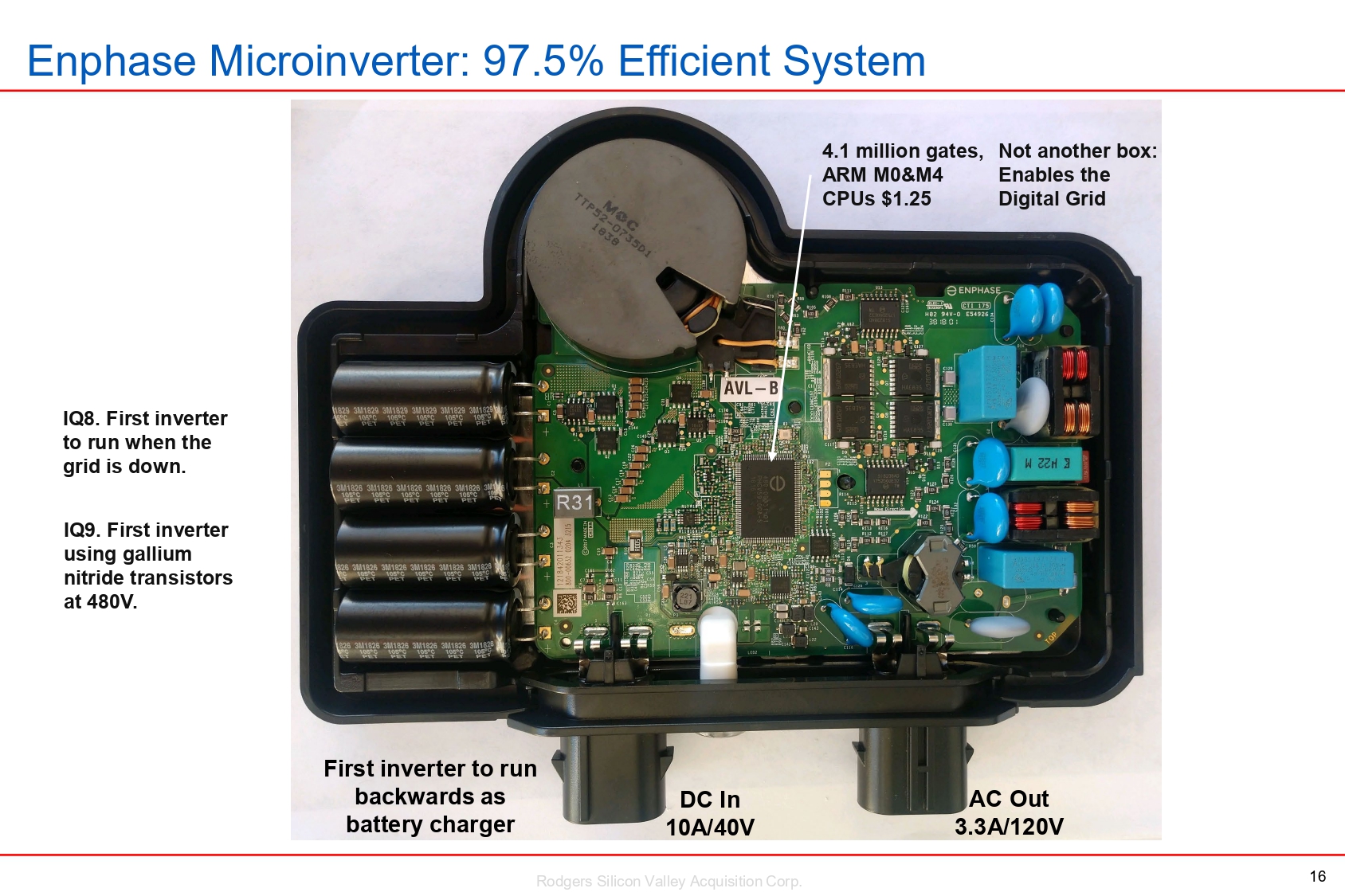 16 Rodgers Silicon Valley Acquisition Corp. Enphase Microinverter: 97.5% Efficient System Not another box: Enables the Digital Grid 4.1 million gates, ARM M0&M4 CPUs $1.25 AC Out 3.3A/120V DC In 10A/40V IQ8. First inverter to run when the grid is down. IQ9. First inverter using gallium nitride transistors at 480V. First inverter to run backwards as battery charger