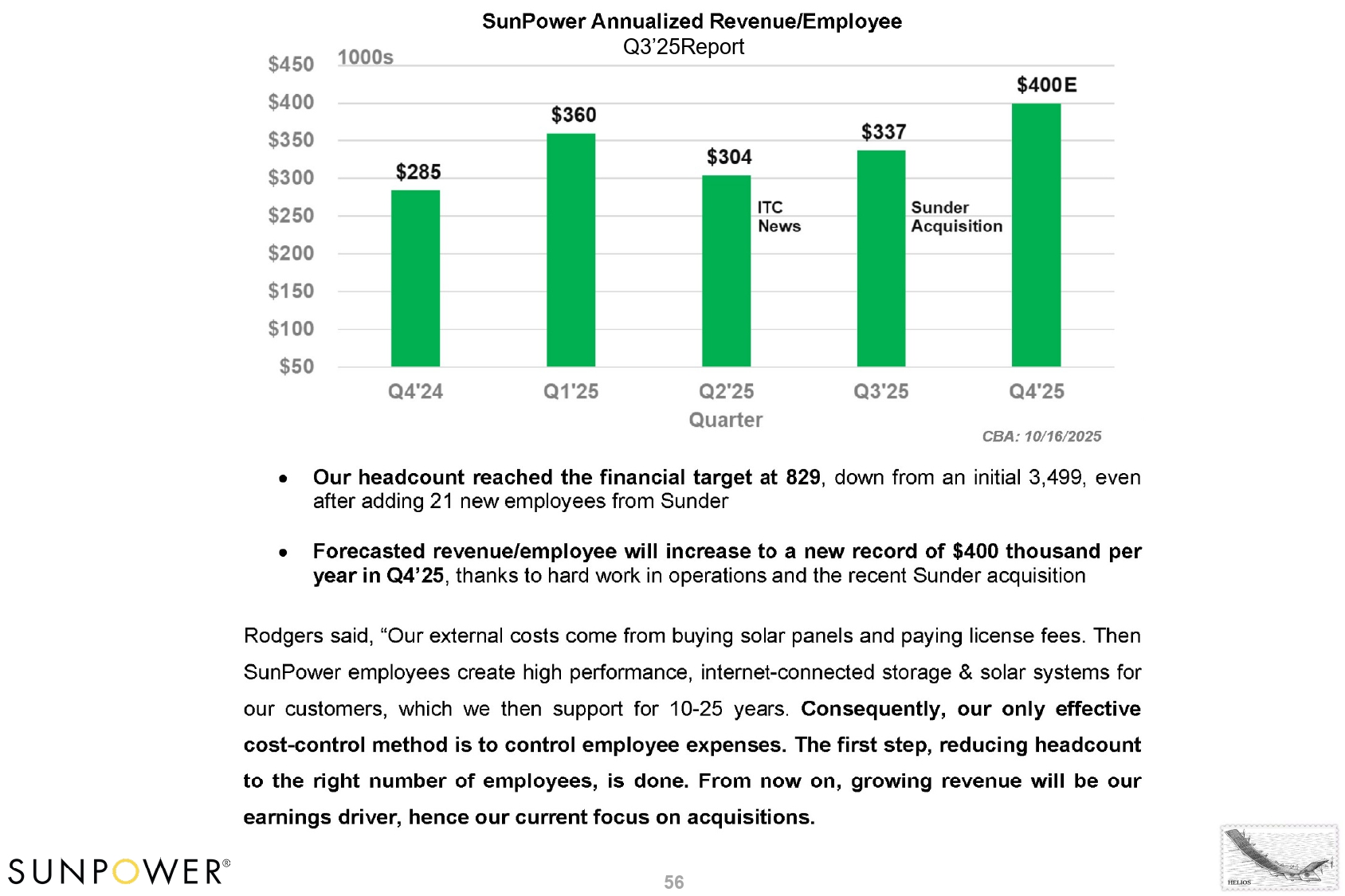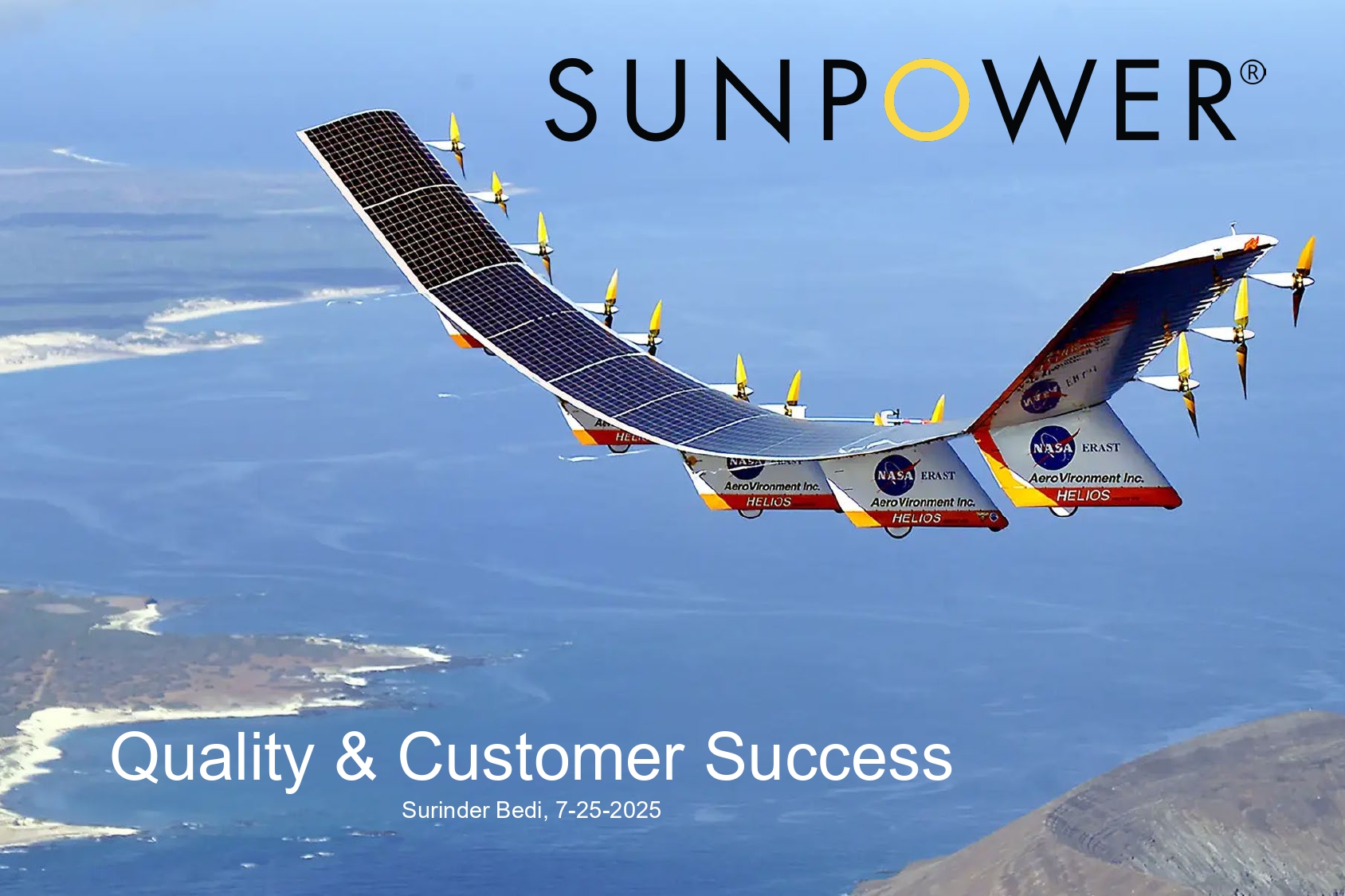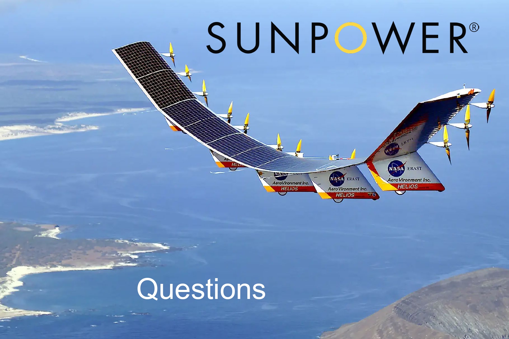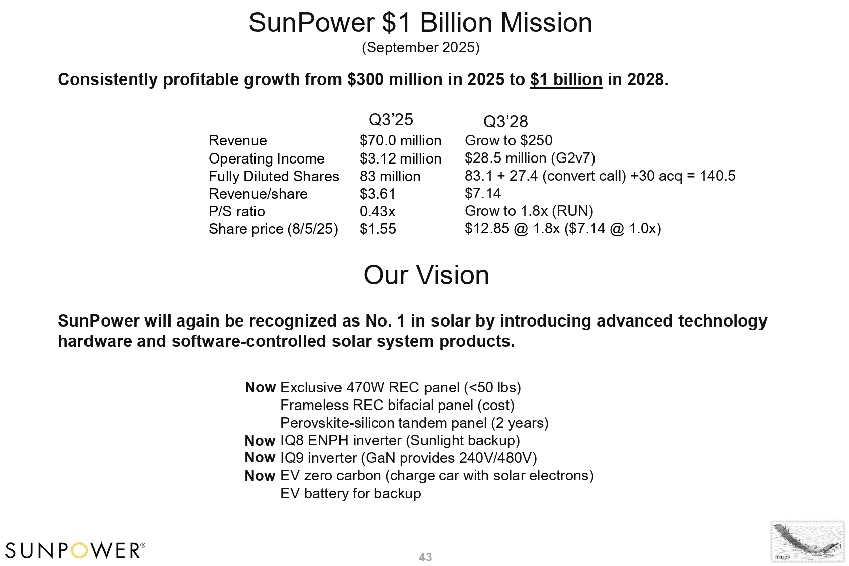 Q3’28 Q3’25 Grow to $250 $70.0 million Revenue $28.5 million (G2v7) $3.12 million Operating Income 83.1 + 27.4 (convert call) +30 acq = 140.5 83 million Fully Diluted Shares $7.14 $3.61 Revenue/share Grow to 1.8x (RUN) 0.43x P/S ratio $12.85 @ 1.8x ($7.14 @ 1.0x) $1.55 Share price (8/5/25) 43 Our Vision SunPower will again be recognized as No. 1 in solar by introducing advanced technology hardware and software - controlled solar system products. Now Exclusive 470W REC panel (<50 lbs) Frameless REC bifacial panel (cost) Perovskite - silicon tandem panel (2 years) Now IQ8 ENPH inverter (Sunlight backup) Now IQ9 inverter (GaN provides 240V/480V) Now EV zero carbon (charge car with solar electrons) EV battery for backup SunPower $1 Billion Mission (September 2025) Consistently profitable growth from $300 million in 2025 to $1 billion in 2028.