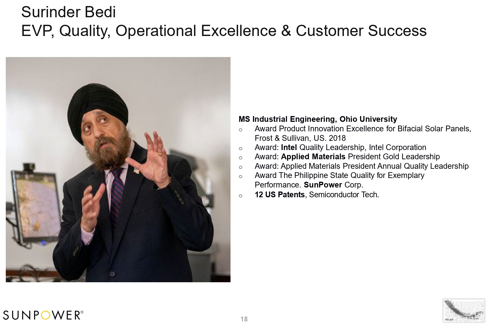 Surinder Bedi EVP, Quality, Operational Excellence & Customer Success 18 18 MS Industrial Engineering, Ohio University o Award Product Innovation Excellence for Bifacial Solar Panels, Frost & Sullivan, US. 2018 o Award: Intel Quality Leadership, Intel Corporation o Award: Applied Materials President Gold Leadership o Award: Applied Materials President Annual Quality Leadership o Award The Philippine State Quality for Exemplary Performance. SunPower Corp. o 12 US Patents , Semiconductor Tech .