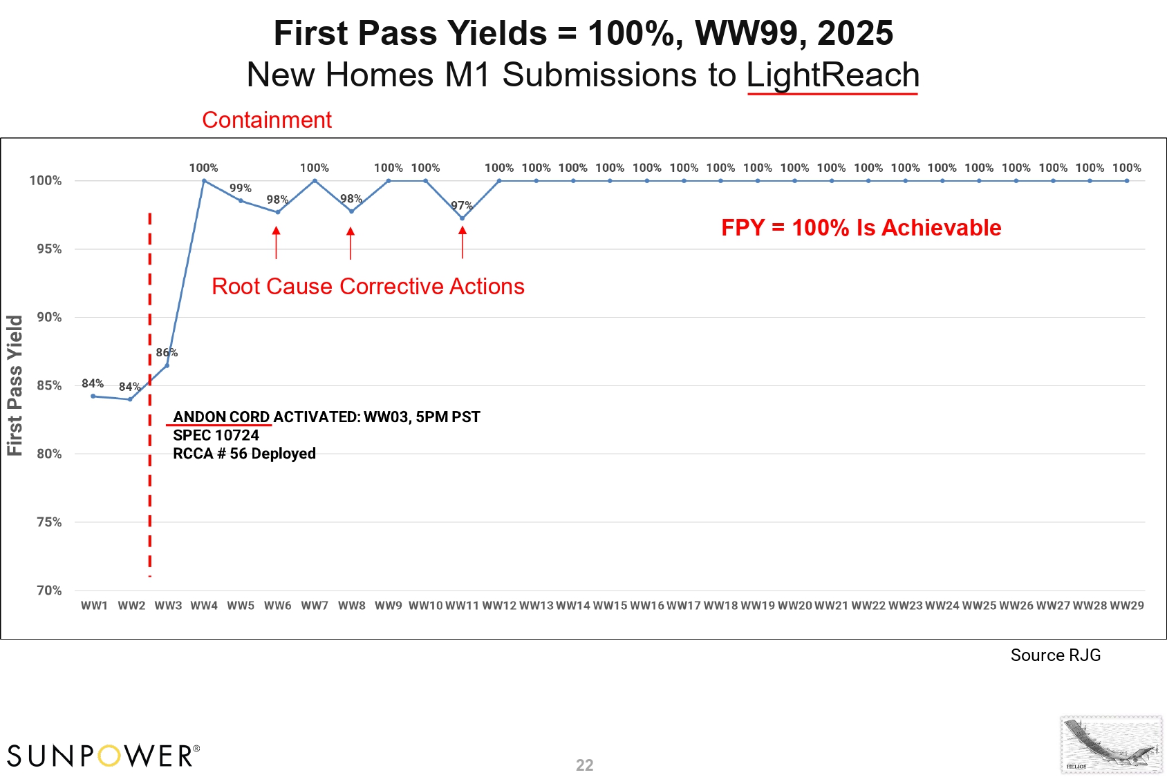 First Pass Yields = 100%, WW99, 2025 New Homes M1 Submissions to LightReach Source RJG FPY = 100% Is Achievable Containment 22 Root Cause Corrective Actions