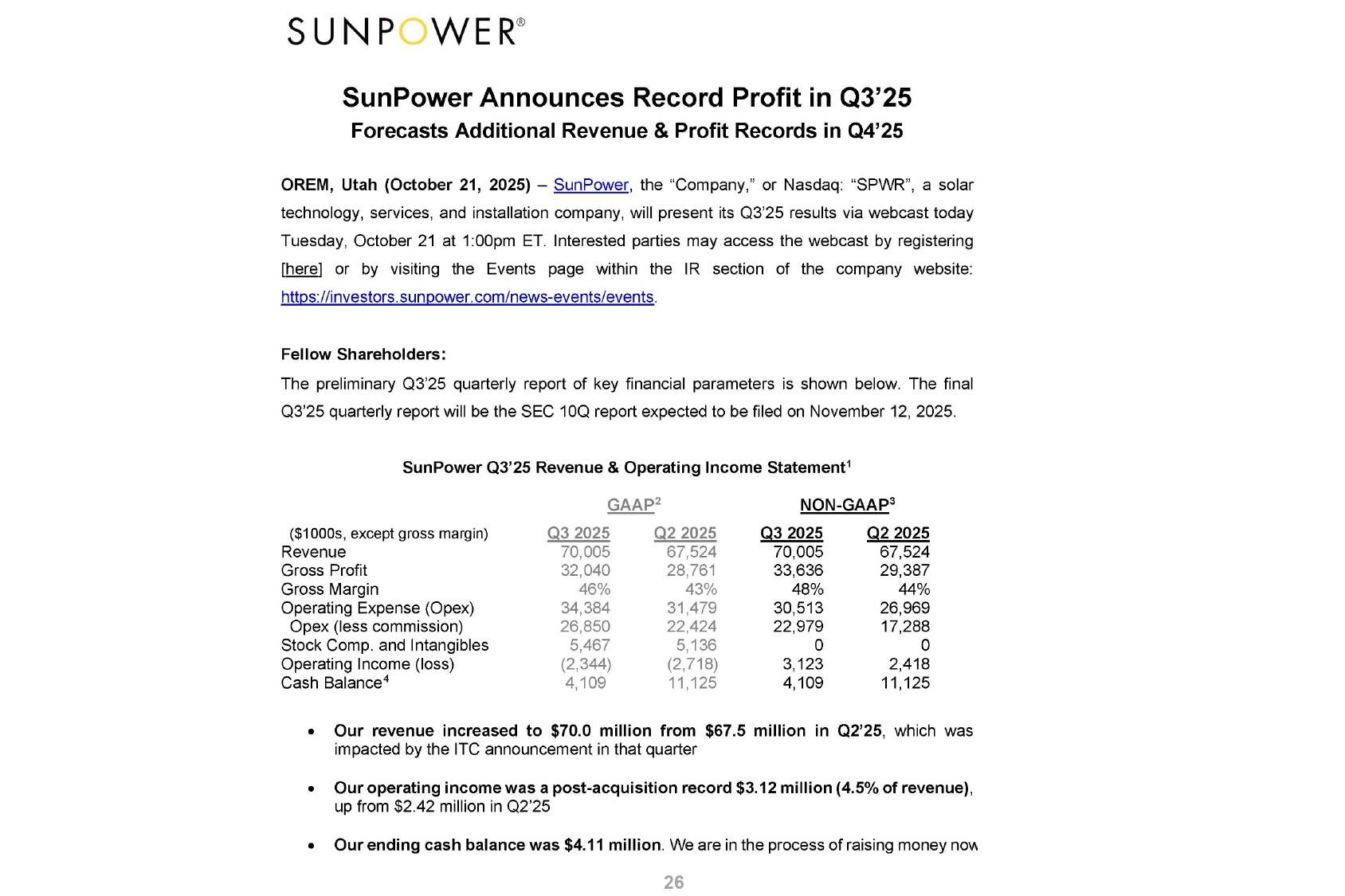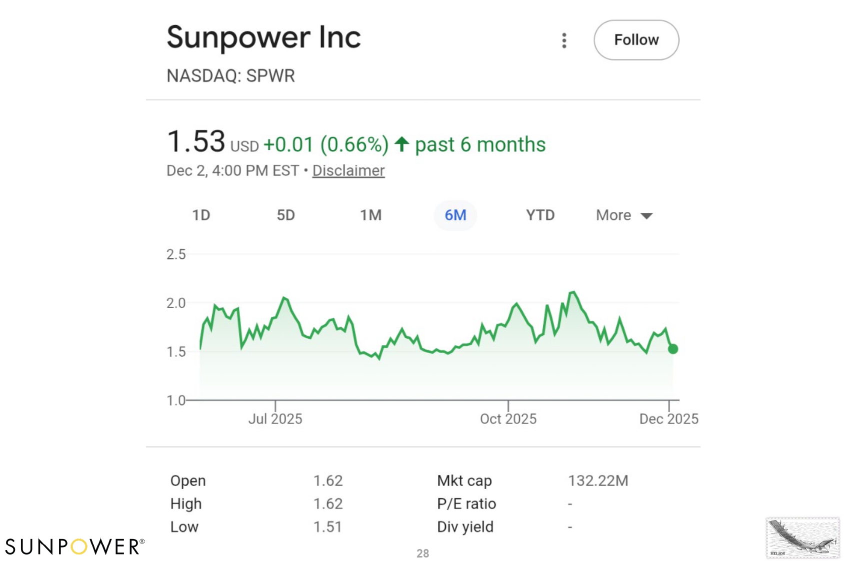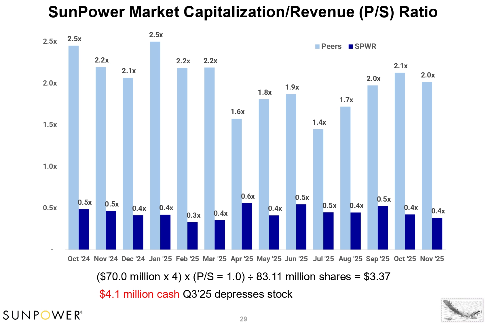 SunPower Market Capitalization/Revenue (P/S) Ratio 2.5x 2.2x 2.1x 2.5x 2.2x 2.2x 1.6x 1.8x 1.9x 1.4x 1.7x 2.0x 2.1x 2.0x 0.5x 0.5x 0.4x 0.4x 0.3x 0.4x 0.6x 0.4x 0.5x 0.5x 0.4x 0.5x 0.4x 0.4x - 0.5x 1.0x 1.5x 2.0x 2.5x Peers SPWR 29 Oct '24 Nov '24 Dec '24 Jan '25 Feb '25 Mar '25 Apr '25 May '25 Jun '25 Jul '25 Aug '25 Sep '25 Oct '25 Nov '25 ($70.0 million x 4) x (P/S = 1.0) р 83.11 million shares = $3.37 $4.1 million cash Q3’25 depresses stock