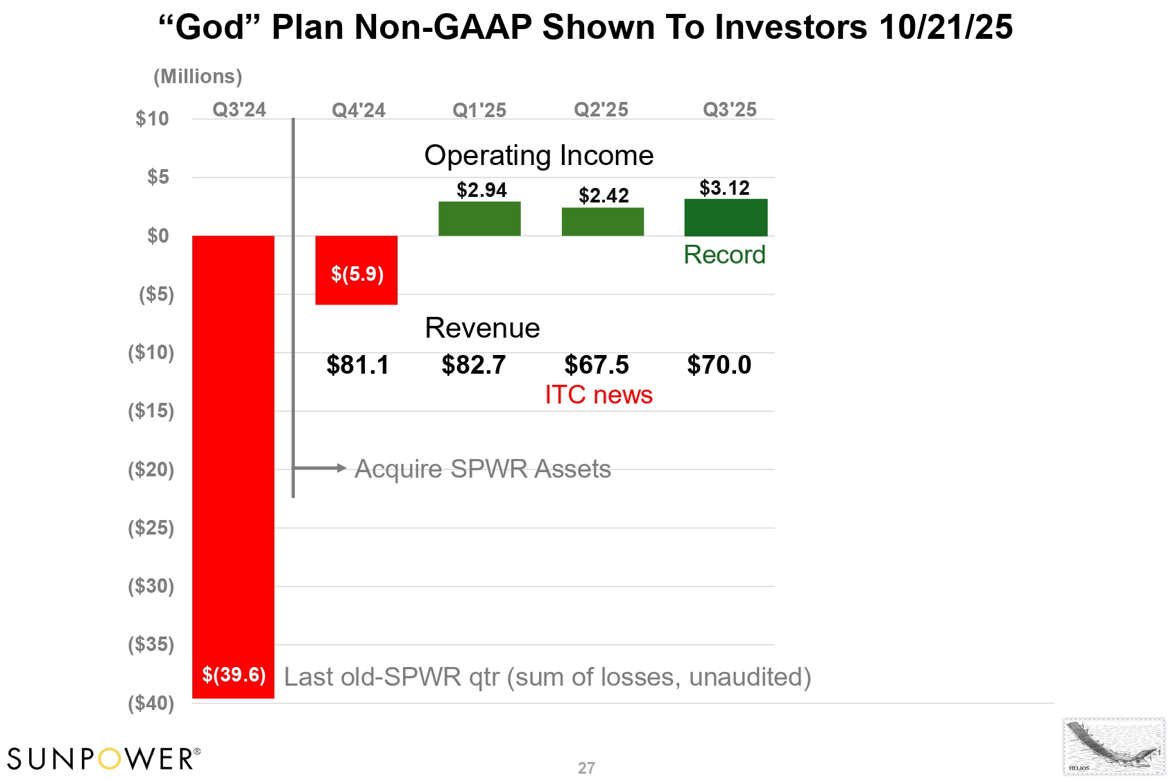 $(39.6) $(5.9) $2.94 $2.42 $3.12 ($40) ($25) ($30) ($35) ($20) ($15) ($10) ($5) $0 $5 $10 Q3'24 Q4'24 Q3'25 (Millions) $81.1 $70.0 $67.5 ITC news Record Revenue $82.7 Acquire SPWR Assets Last old - SPWR qtr (sum of losses, unaudited) “God” Plan Non - GAAP Shown To Investors 10/21/25 Q1'25 Q2'25 Operating Income Q4'25E Q1'26E $3.56 $2.00 Record Minimum $88.0 $83.3 Record Acquire Sunder Acquire Ambia ? 27