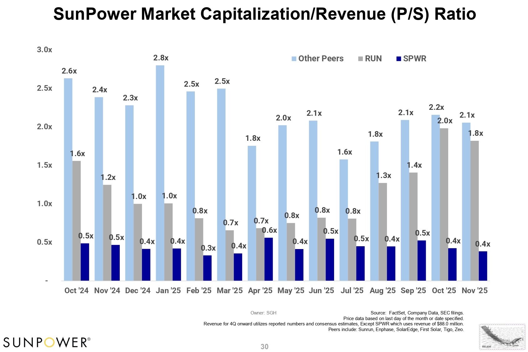 2.6x 2.4x 2.3x 2.8x 2.5x 2.5x 1.8x 2.0x 2.1x 1.6x 1.8x 2.1x 2.2x 2.1x 1.6x 1.2x 1.0x 1.0x 0.8x 0.7x 0.7x 0.8x 0.8x 0.8x 1.3x 1.4x 2.0x 1.8x 0.5x 0.5x 0.4x 0.4x 0.3x 0.4x 0.6x 0.4x 0.5x 0.5x 0.4x 0.5x 0.4x 0.4x - Oct '24 Nov '24 Dec '24 Jan '25 Feb '25 Mar '25 Apr '25 May '25 Jun '25 Jul '25 Aug '25 Sep '25 Oct '25 Nov '25 0.5x 1.0x 1.5x 2.0x 2.5x 3.0x Other Peers RUN SPWR 30 Owner: SGH Source: FactSet, Company Data, SEC filings. Price data based on last day of the month or date specified. Revenue for 4Q onward utilizes reported numbers and consensus estimates, Except SPWR which uses revenue of $88.0 million. Peers include: Sunrun, Enphase, SolarEdge, First Solar, Tigo, Zeo. SunPower Market Capitalization/Revenue (P/S) Ratio
