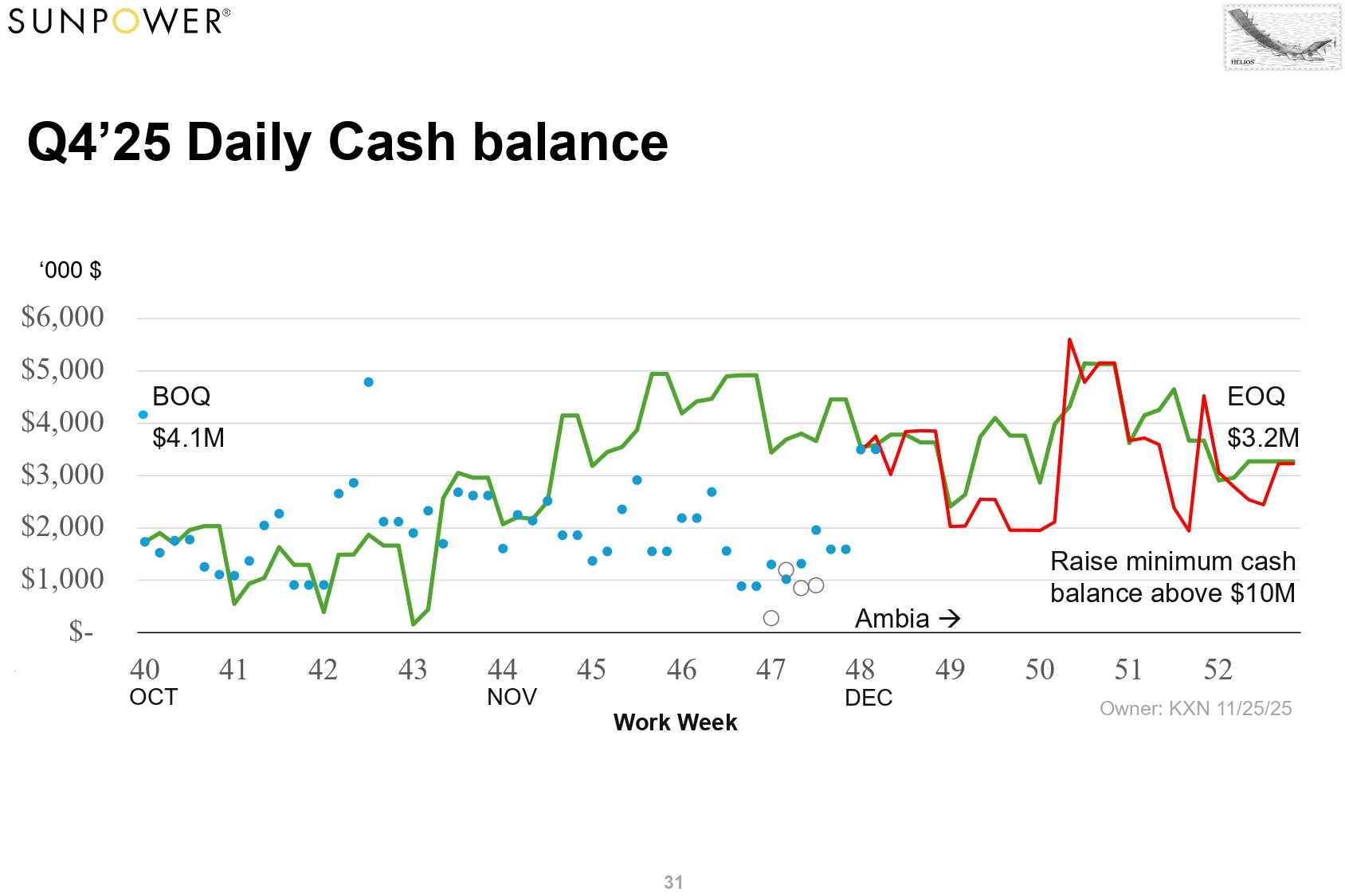 $(1,000) $(2,000) $(3,000) ‘000 $ $6,000 $5,000 $4,000 $3,000 $2,000 $1,000 $ - Q4’25 Daily Cash balance BOQ $4.1M EOQ $3.2M Ambia Work Week NOV DEC Raise minimum cash balance above $10M 40 41 42 43 44 45 46 47 48 49 50 51 52 OCT Owner: KXN 11/25/25 31