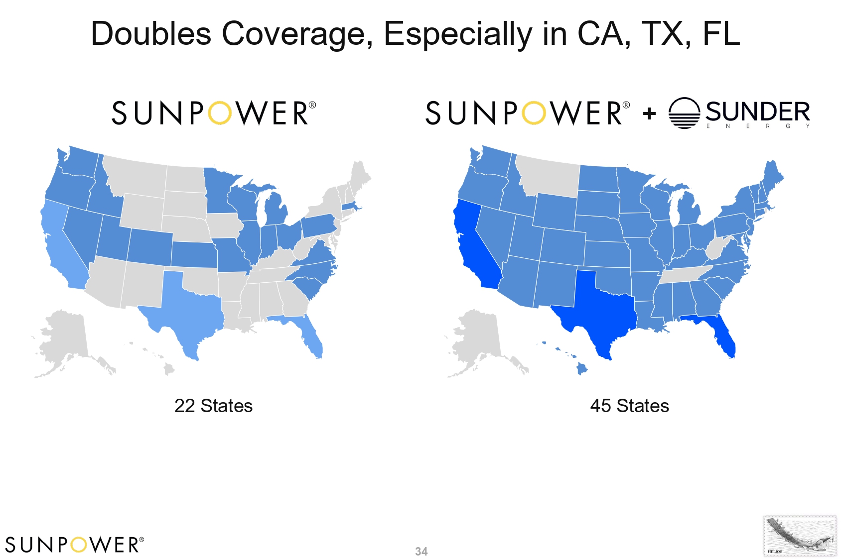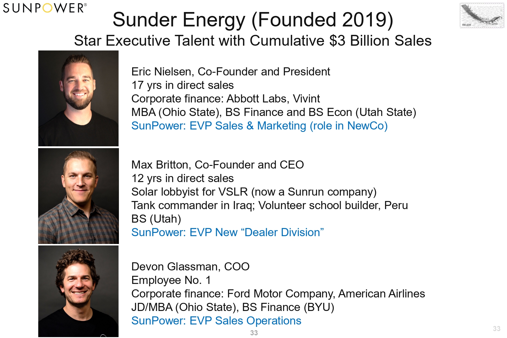Sunder Energy (Founded 2019) Star Executive Talent with Cumulative $3 Billion Sales Eric Nielsen, Co - Founder and President 17 yrs in direct sales Corporate finance: Abbott Labs, Vivint MBA (Ohio State), BS Finance and BS Econ (Utah State) SunPower: EVP Sales & Marketing (role in NewCo) Max Britton, Co - Founder and CEO 12 yrs in direct sales Solar lobbyist for VSLR (now a Sunrun company) Tank commander in Iraq; Volunteer school builder, Peru BS (Utah) SunPower: EVP New “Dealer Division” Devon Glassman, COO Employee No. 1 Corporate finance: Ford Motor Company, American Airlines JD/MBA (Ohio State), BS Finance (BYU) SunPower: EVP Sales Operations 33 33