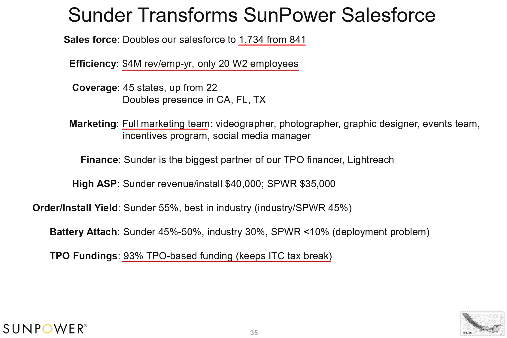 Sunder Transforms SunPower Salesforce Sales force : Doubles our salesforce to 1,734 from 841 Efficiency : $4M rev/emp - yr, only 20 W2 employees Coverage : 45 states, up from 22 Doubles presence in CA, FL, TX Marketing : Full marketing team : videographer, photographer, graphic designer, events team, incentives program, social media manager Finance : Sunder is the biggest partner of our TPO financer, Lightreach High ASP : Sunder revenue/install $40,000; SPWR $35,000 Order/Install Yield : Sunder 55%, best in industry (industry/SPWR 45%) Battery Attach : Sunder 45% - 50%, industry 30%, SPWR <10% (deployment problem) TPO Fundings : 93% TPO - based funding (keeps ITC tax break) 35 35
