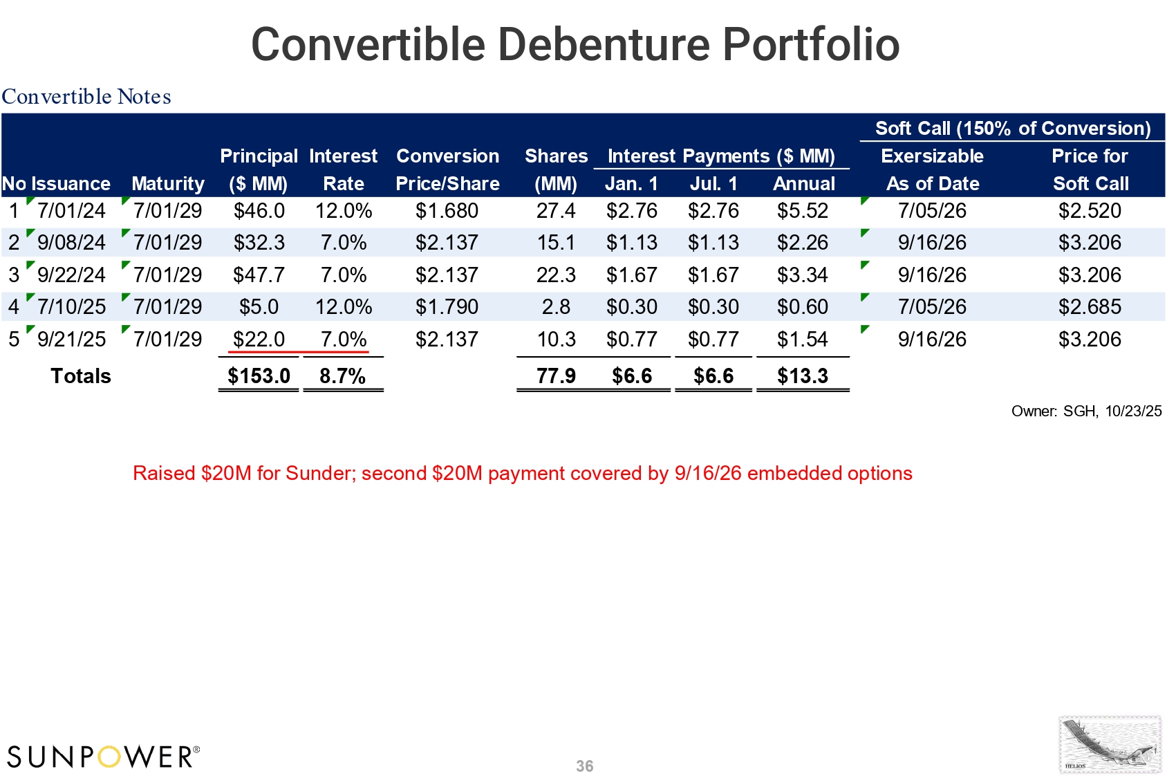 Convertible Debenture Portfolio Convertible Notes Maturity Conversion Price/Share Shares (MM) Exersizable As of Date Price for Soft Call 7/01/29 $1.680 7/05/26 $2.520 7/01/29 $2.137 9/16/26 $3.206 No Issuance 1 7/01/24 2 9/08/24 3 9/22/24 7/01/29 $2.137 9/16/26 $3.206 4 7/10/25 7/01/29 $1.790 7/05/26 $2.685 7/01/29 $2.137 9/16/26 $3.206 5 9/21/25 Totals Principal Interest ($ MM) Rate $46.0 12.0% $32.3 7.0% $47.7 7.0% $5.0 12.0% $22.0 7.0% $153.0 8.7% Owner: SGH, 10/23/25 Soft Call (150% of Conversion) Interest Payments ($ MM) Jan. 1 Jul. 1 Annual 27.4 $2.76 $2.76 $5.52 15.1 $1.13 $1.13 $2.26 22.3 $1.67 $1.67 $3.34 2.8 $0.30 $0.30 $0.60 10.3 $0.77 $0.77 $1.54 77.9 $6.6 $6.6 $13.3 Raised $20M for Sunder; second $20M payment covered by 9/16/26 embedded options 36 36