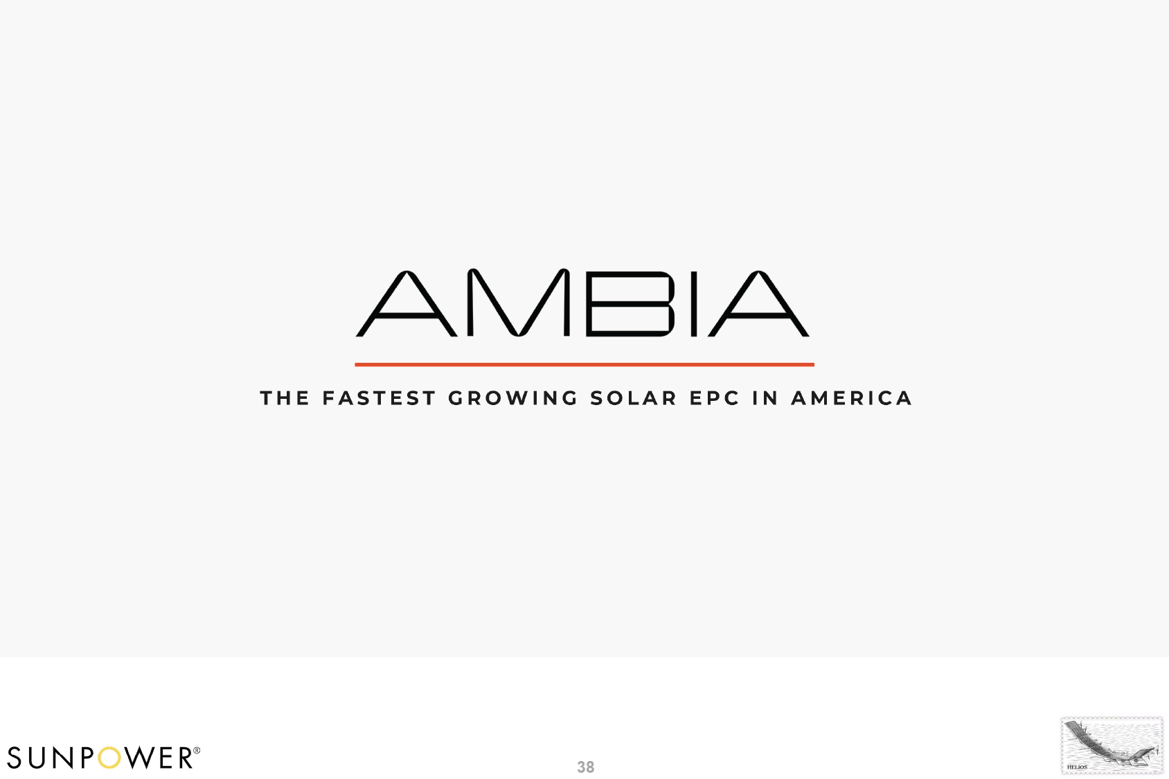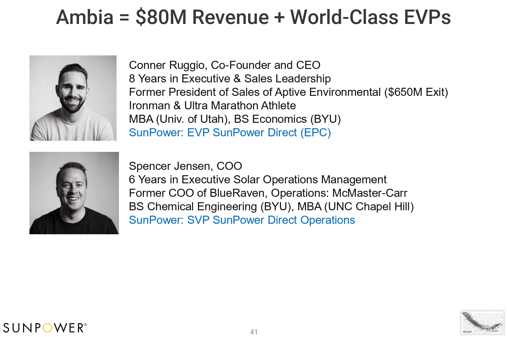 Ambia = $80M Revenue + World - Class EVPs Conner Ruggio, Co - Founder and CEO 8 Years in Executive & Sales Leadership Former President of Sales of Aptive Environmental ($650M Exit) Ironman & Ultra Marathon Athlete MBA (Univ. of Utah), BS Economics (BYU) SunPower: EVP SunPower Direct (EPC) Spencer Jensen, COO 6 Years in Executive Solar Operations Management Former COO of BlueRaven, Operations: McMaster - Carr BS Chemical Engineering (BYU), MBA (UNC Chapel Hill) SunPower: SVP SunPower Direct Operations 41