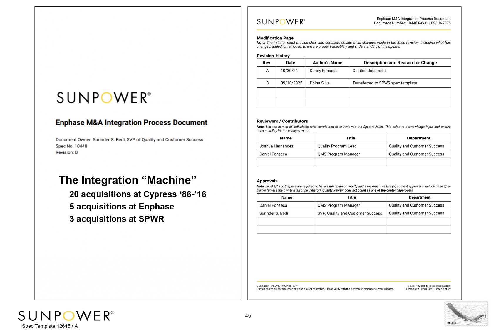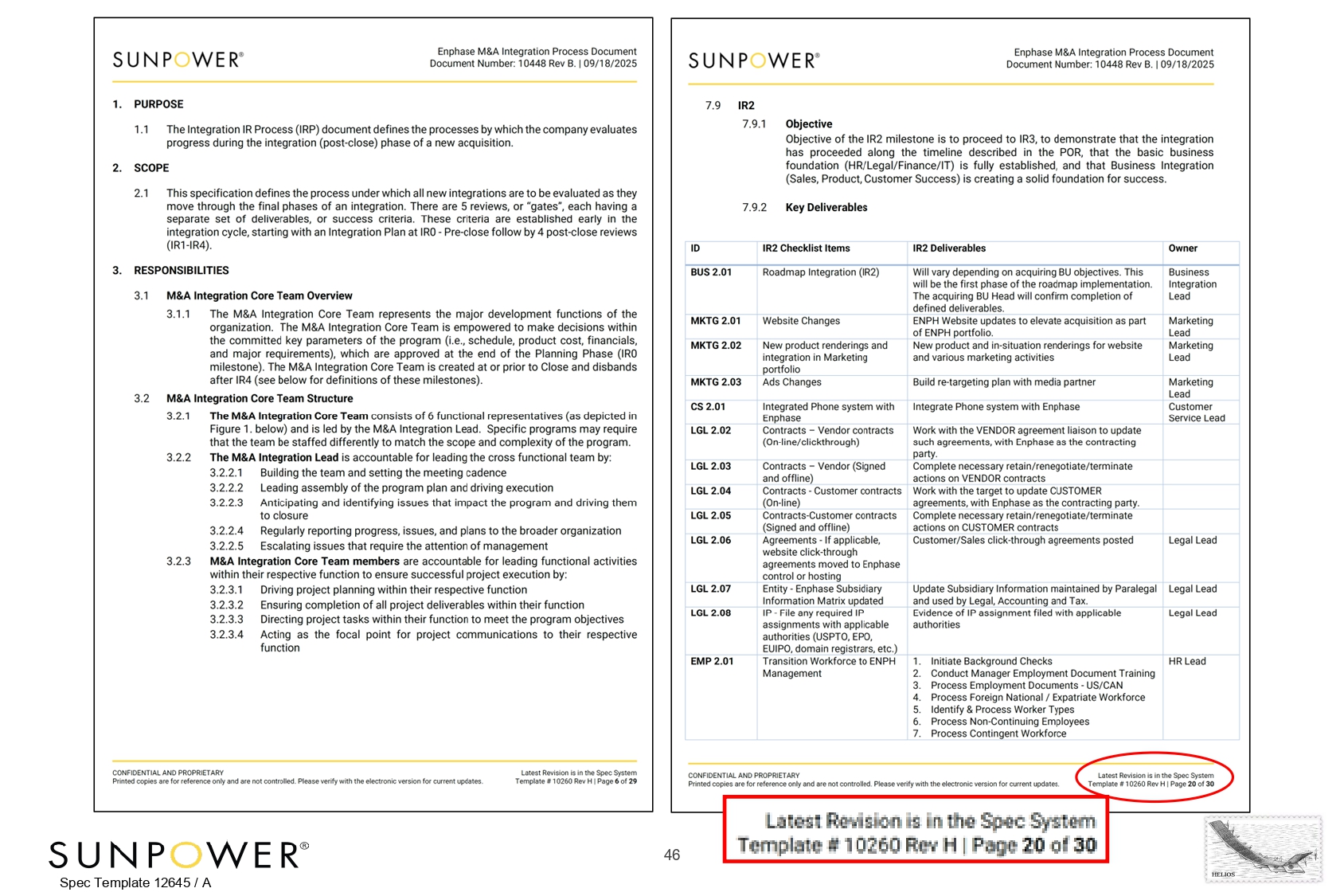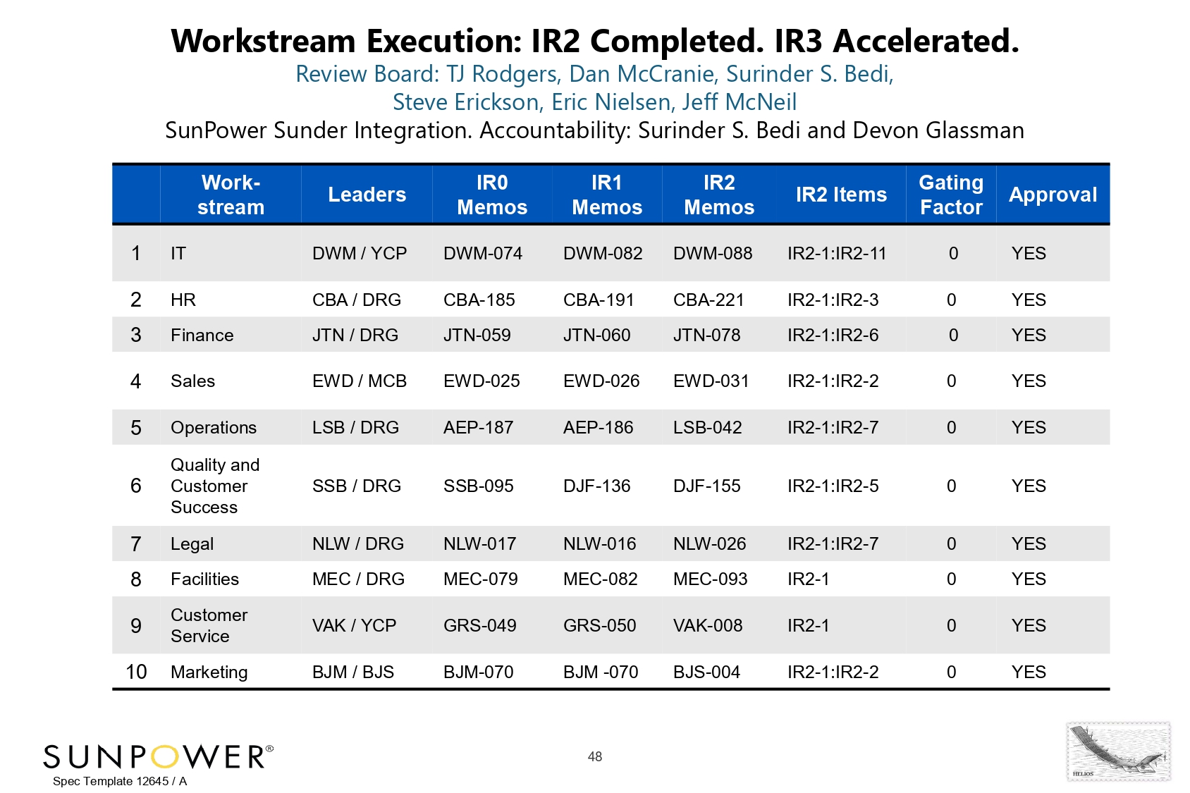 Workstream Execution: IR2 Completed. IR3 Accelerated. 48 Spec Template 12645 / A Review Board: TJ Rodgers, Dan McCranie, Surinder S. Bedi, Steve Erickson, Eric Nielsen, Jeff McNeil SunPower Sunder Integration. Accountability: Surinder S. Bedi and Devon Glassman Approval Gating Factor IR2 Items IR2 Memos IR1 Memos IR0 Memos Leaders Work - stream YES 0 IR2 - 1:IR2 - 11 DWM - 088 DWM - 082 DWM - 074 DWM / YCP IT 1 YES 0 IR2 - 1:IR2 - 3 CBA - 221 CBA - 191 CBA - 185 CBA / DRG HR 2 YES 0 IR2 - 1:IR2 - 6 JTN - 078 JTN - 060 JTN - 059 JTN / DRG Finance 3 YES 0 IR2 - 1:IR2 - 2 EWD - 031 EWD - 026 EWD - 025 EWD / MCB Sales 4 YES 0 IR2 - 1:IR2 - 7 LSB - 042 AEP - 186 AEP - 187 LSB / DRG Operations 5 YES 0 IR2 - 1:IR2 - 5 DJF - 155 DJF - 136 SSB - 095 SSB / DRG Quality and Customer Success 6 YES 0 IR2 - 1:IR2 - 7 NLW - 026 NLW - 016 NLW - 017 NLW / DRG Legal 7 YES 0 IR2 - 1 MEC - 093 MEC - 082 MEC - 079 MEC / DRG Facilities 8 YES 0 IR2 - 1 VAK - 008 GRS - 050 GRS - 049 VAK / YCP Customer Service 9 YES 0 IR2 - 1:IR2 - 2 BJS - 004 BJM - 070 BJM - 070 BJM / BJS Marketing 10