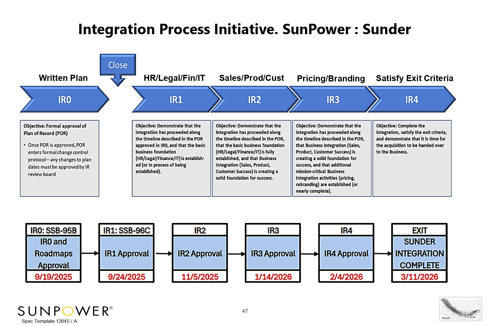 Integration Process Initiative. SunPower : Sunder HR/Legal/Fin/IT 47 Spec Template 12645 / A Sales/Prod/Cust Pricing/Branding Satisfy Exit Criteria Written Plan