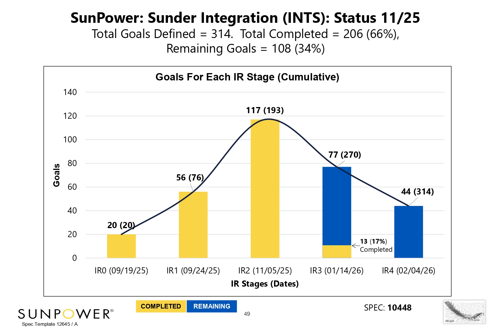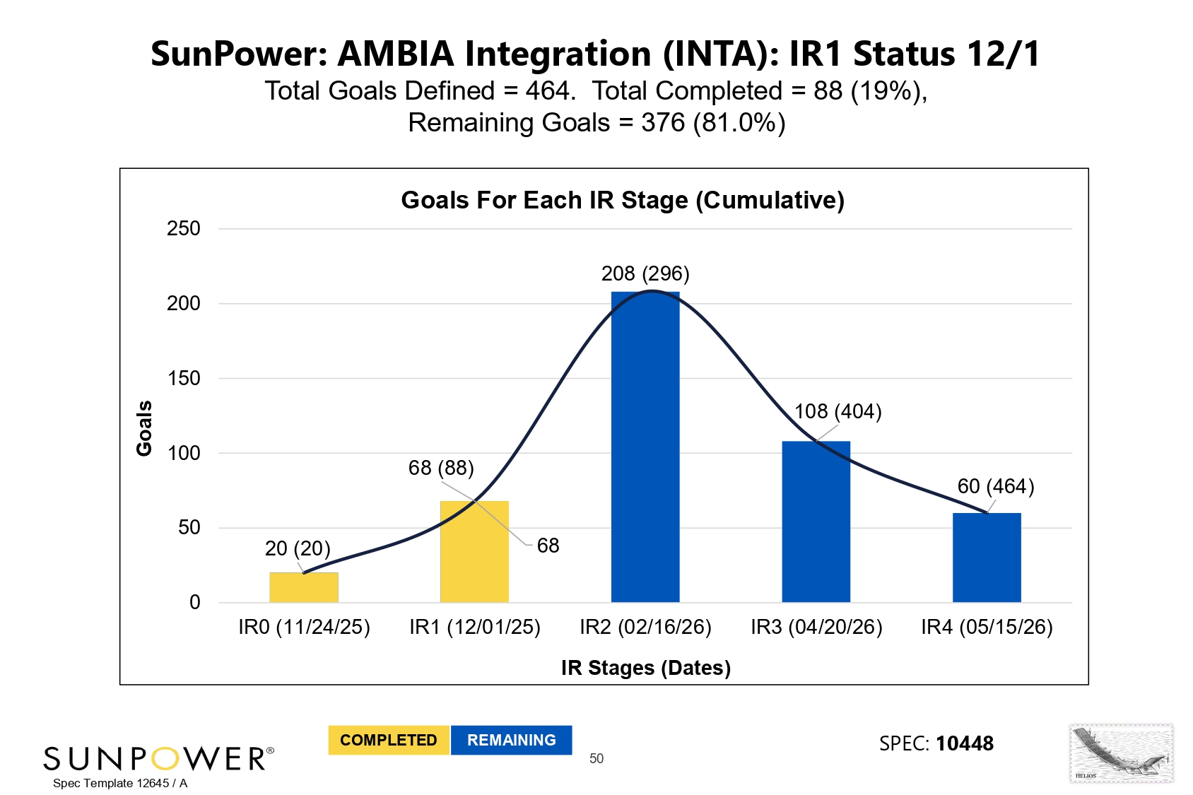 50 SunPower: AMBIA Integration (INTA): IR1 Status 12/1 Total Goals Defined = 464. Total Completed = 88 (19%), Remaining Goals = 376 (81.0%) SPEC: 10448 COMPLETED REMAINING 20 (20) 68 (88) 208 (296) 108 (404) 60 (464) 68 0 50 100 200 150 250 IR0 (11/24/25) IR1 (12/01/25) IR3 (04/20/26) IR4 (05/15/26) Goals IR2 (02/16/26) IR Stages (Dates) Goals For Each IR Stage (Cumulative) Spec Template 12645 / A