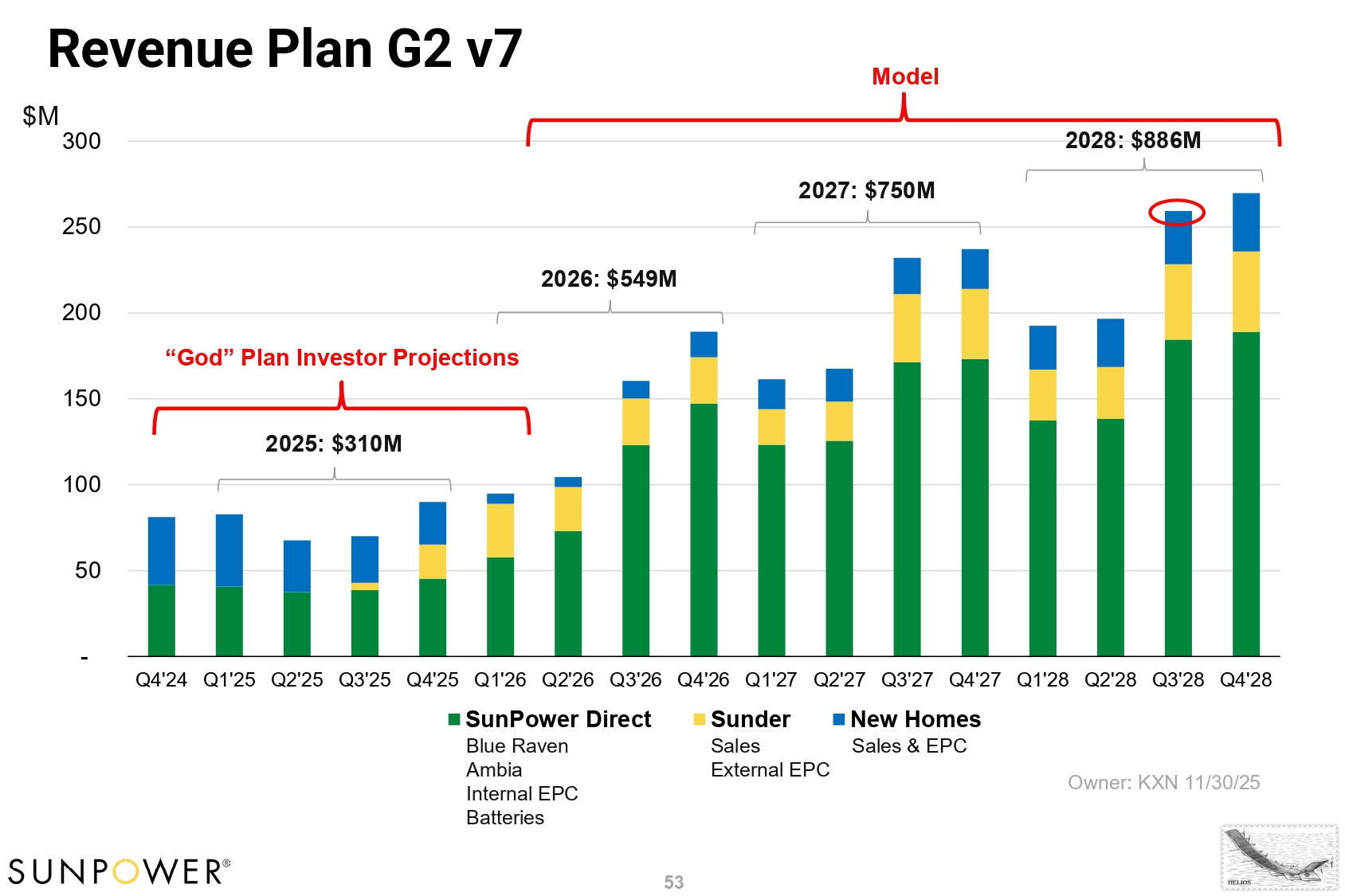 - 50 100 150 200 250 $M 300 Q4'26 Q1'27 Q2'27 Q3'27 Q4'27 Q1'28 Q2'28 Q3'28 Q4'28 Sunder Sales External EPC New Homes Sales & EPC Revenue Plan G2 v7 Owner: KXN 11/30/25 Q4'24 Q1'25 Q2'25 Q3'25 Q4'25 Q1'26 Q2'26 Q3'26 SunPower Direct Blue Raven Ambia Internal EPC Batteries 2025: $310M 2026: $549M 2027: $750M 2028: $886M “God” Plan Investor Projections Model 53
