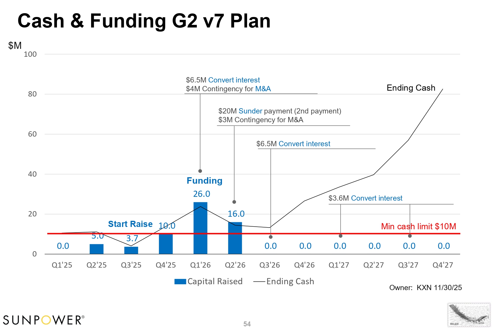 Cash & Funding G2 v7 Plan Q1'27 Q2'27 Q3'27 Q4'27 Owner: KXN 11/30/25 $M 100 0.0 5.0 3.7 10.0 16.0 0.0 0.0 0.0 0.0 0 20 40 60 80 Q1'25 Q2'25 Q3'25 Q4'25 Q1'26 Q2'26 Q3'26 Q4'26 Capital Raised Ending Cash Min cash limit $10M 0.0 0.0 Ending Cash Funding 26.0 Start Raise $6.5M Convert interest $4M Contingency for M&A $20M Sunder payment (2nd payment) $3M Contingency for M&A $6.5M Convert interest $3.6M Convert interest 54