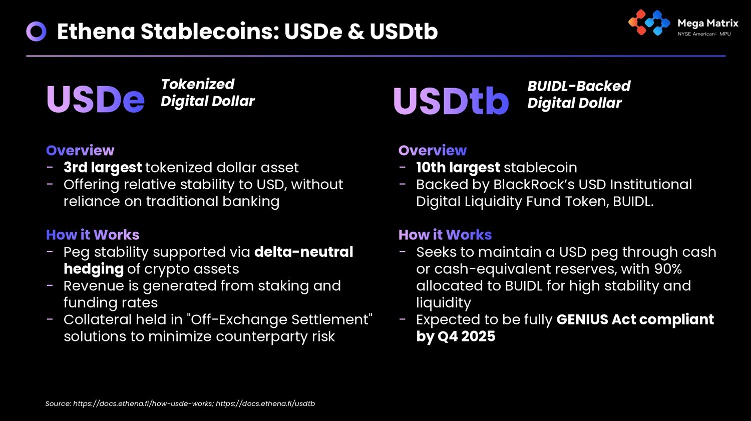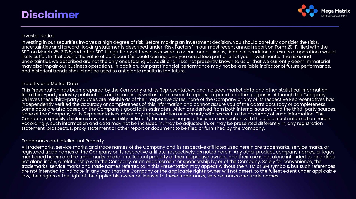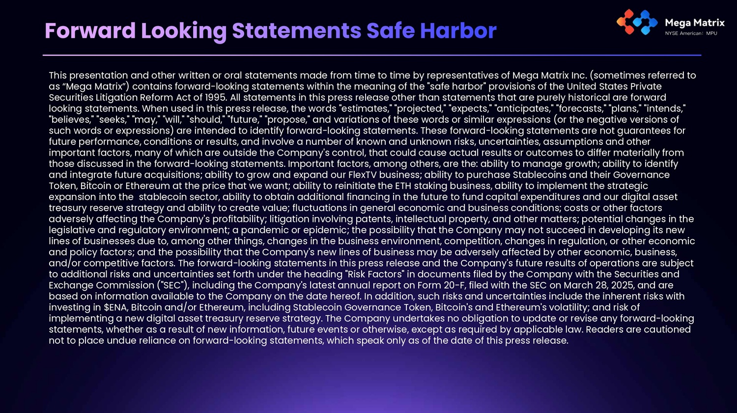 This presentation and other written or oral statements made from time to time by representatives of Mega Matrix Inc. (sometimes referred to as “Mega Matrix”) contains forward - looking statements within the meaning of the "safe harbor" provisions of the United States Private Securities Litigation Reform Act of 1995. All statements in this press release other than statements that are purely historical are forward looking statements. When used in this press release, the words "estimates," "projected," "expects," "anticipates," "forecasts," "plans," "intends," "believes," "seeks," "may," "will," "should," "future," "propose," and variations of these words or similar expressions (or the negative versions of such words or expressions) are intended to identify forward - looking statements. These forward - looking statements are not guarantees for future performance, conditions or results, and involve a number of known and unknown risks, uncertainties, assumptions and other important factors, many of which are outside the Company's control, that could cause actual results or outcomes to differ materially from those discussed in the forward - looking statements. Important factors, among others, are the: ability to manage growth; ability to identify and integrate future acquisitions; ability to grow and expand our FlexTV business; ability to purchase Stablecoins and their Governance Token, Bitcoin or Ethereum at the price that we want; ability to reinitiate the ETH staking business, ability to implement the strategic expansion into the stablecoin sector, ability to obtain additional financing in the future to fund capital expenditures and our digital asset treasury reserve strategy and ability to create value; fluctuations in general economic and business conditions; costs or other factors adversely affecting the Company's profitability; litigation involving patents, intellectual property, and other matters; potential changes in the legislative and regulatory environment; a pandemic or epidemic; the possibility that the Company may not succeed in developing its new lines of businesses due to, among other things, changes in the business environment, competition, changes in regulation, or other economic and policy factors; and the possibility that the Company's new lines of business may be adversely affected by other economic, business, and/or competitive factors. The forward - looking statements in this press release and the Company's future results of operations are subject to additional risks and uncertainties set forth under the heading "Risk Factors" in documents filed by the Company with the Securities and Exchange Commission ("SEC"), including the Company's latest annual report on Form 20 - F, filed with the SEC on March 28, 2025, and are based on information available to the Company on the date hereof. In addition, such risks and uncertainties include the inherent risks with investing in $ENA, Bitcoin and/or Ethereum, including Stablecoin Governance Token, Bitcoin's and Ethereum's volatility; and risk of implementing a new digital asset treasury reserve strategy. The Company undertakes no obligation to update or revise any forward - looking statements, whether as a result of new information, future events or otherwise, except as required by applicable law. Readers are cautioned not to place undue reliance on forward - looking statements, which speak only as of the date of this press release.
