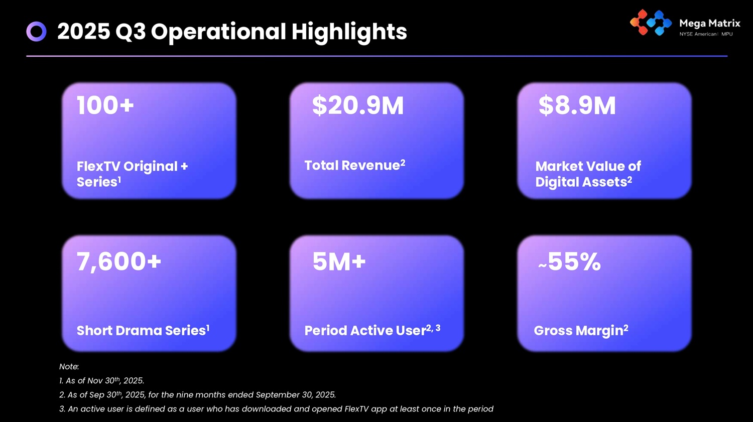 FlexTV Original + Series 1 Total Revenue 2 Market Value of Digital Assets 2 Gross Margin 2 100+ $20.9M $8.9M 5M+ ~ 55% 7,600+ Short Drama Series 1 Period Active User 2, 3 Note: 1. As of Nov 30 th , 2025. 2. As of Sep 30 th , 2025, for the nine months ended September 30, 2025. 3. An active user is defined as a user who has downloaded and opened FlexTV app at least once in the period 2025 Q3 Operational Highlights 2025 Q3 Financial Performance Briefing Note: 1.