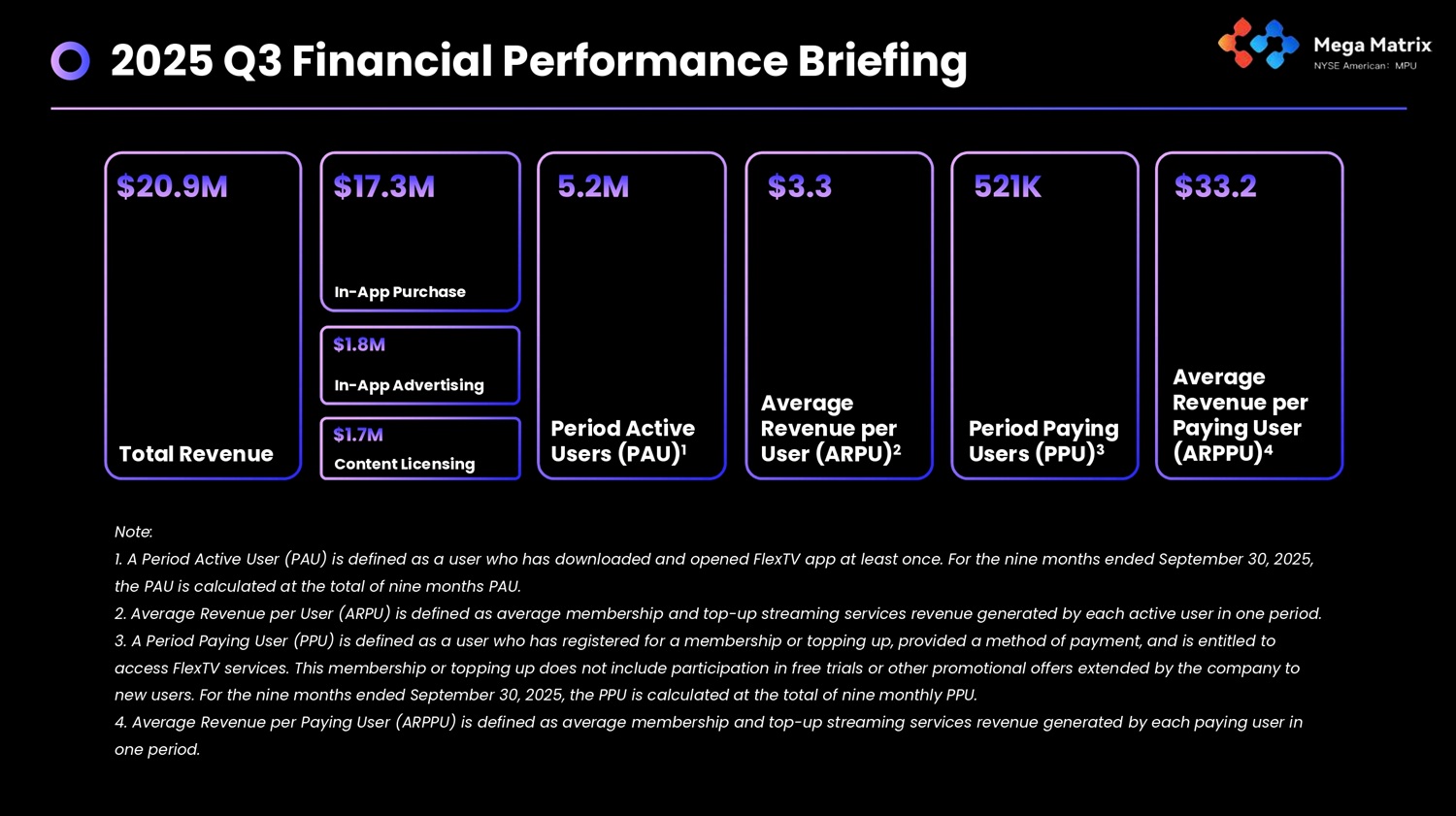 A Period Active User (PAU) is defined as a user who has downloaded and opened FlexTV app at least once. For the nine months ended September 30, 2025, the PAU is calculated at the total of nine months PAU. 2. Average Revenue per User (ARPU) is defined as average membership and top - up streaming services revenue generated by each active user in one period. 3. A Period Paying User (PPU) is defined as a user who has registered for a membership or topping up, provided a method of payment, and is entitled to access FlexTV services. This membership or topping up does not include participation in free trials or other promotional offers extended by the company to new users. For the nine months ended September 30, 2025, the PPU is calculated at the total of nine monthly PPU. 4. Average Revenue per Paying User (ARPPU) is defined as average membership and top - up streaming services revenue generated by each paying user in one period.