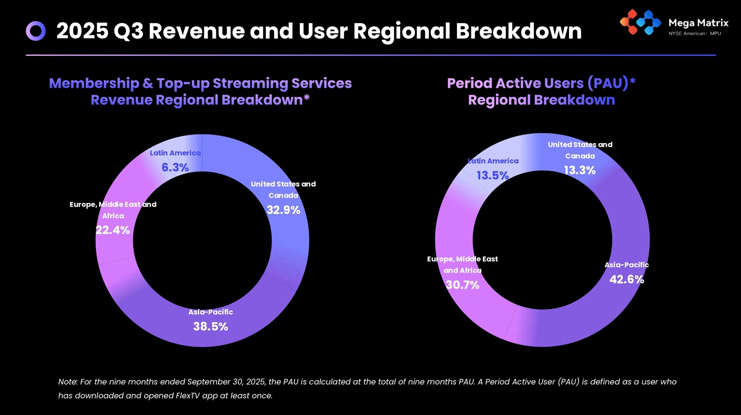 Total Revenue Period Active Users (PAU) 1 Average Revenue per User (ARPU) 2 Average Revenue per Paying User (ARPPU) 4 Period Paying Users (PPU) 3 Content Licensing In - App Advertising In - App Purchase United States and Canada 32.9% Asia - Pacific 38.5% Europe, Middle East and Africa 22.4% Latin America 6.3% United States and Canada 13.3% Asia - Pacific 42.6% Europe, Middle East and Africa 30.7% Latin America 13.5% 2025 Q3 Revenue and User Regional Breakdown Note: For the nine months ended September 30, 2025, the PAU is calculated at the total of nine months PAU. A Period Active User (PAU) is defined as a user who has downloaded and opened FlexTV app at least once.