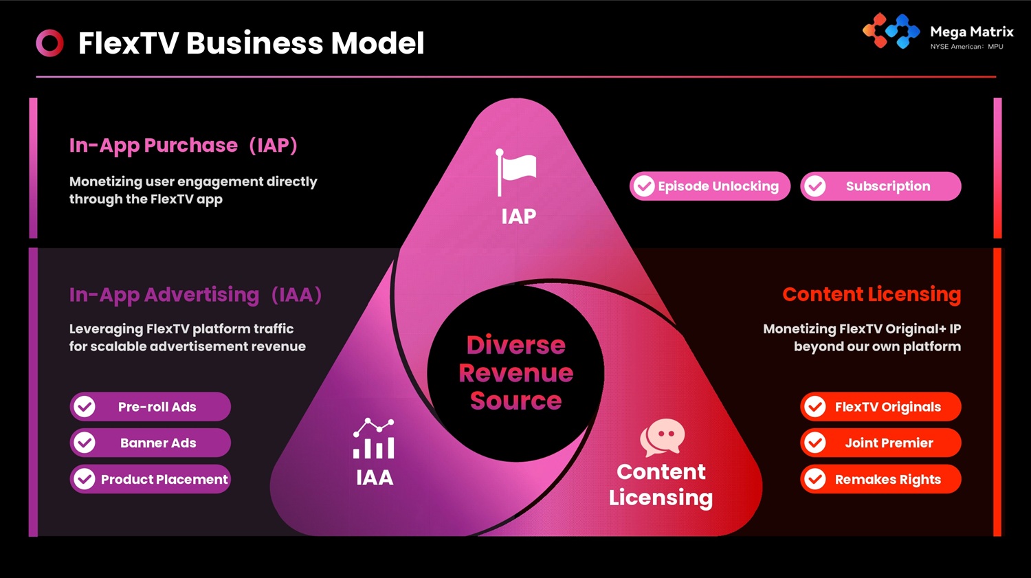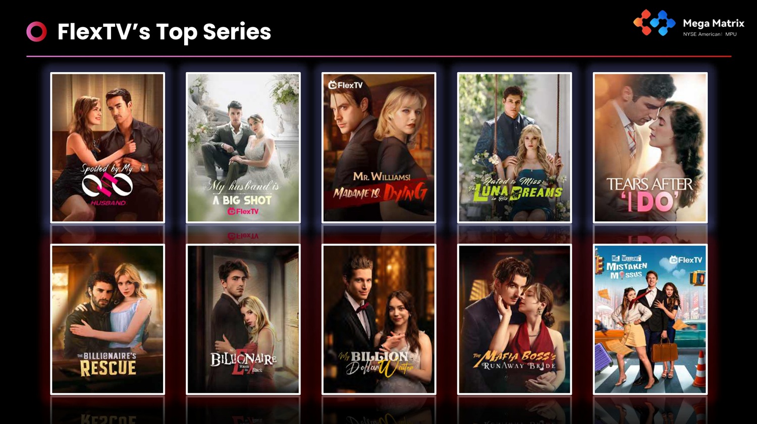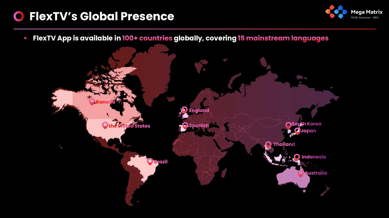 It is ▪ Global short drama market size was estimated at expected to reach , representing a five year FlexTV Overview FlexTV Home Page FlexTV Original+ FlexTV , the flagship product of Mega Matrix Inc. (NYSE American : MPU), is a global leader in short - form vertical drama technology . As the first short drama company publicly listed in the U . S . , MPU is advancing its growth through a dual - engine strategy of content production and global distribution, with the goal of building a full - stack content ecosystem encompassing original IP development, AI oriented efficient production, intelligent distribution, user acquisition, and IP commercialization . FlexTV features 7 , 600 + short - drama series and has produced 100 + original series , covering a wide range of high - demand genres and localized into 15 languages . Supported by robust in - house production capabilities, an efficient multi - language localization pipeline, and an expanding global distribution network, FlexTV reaches more than 10 million users across 100 + countries .