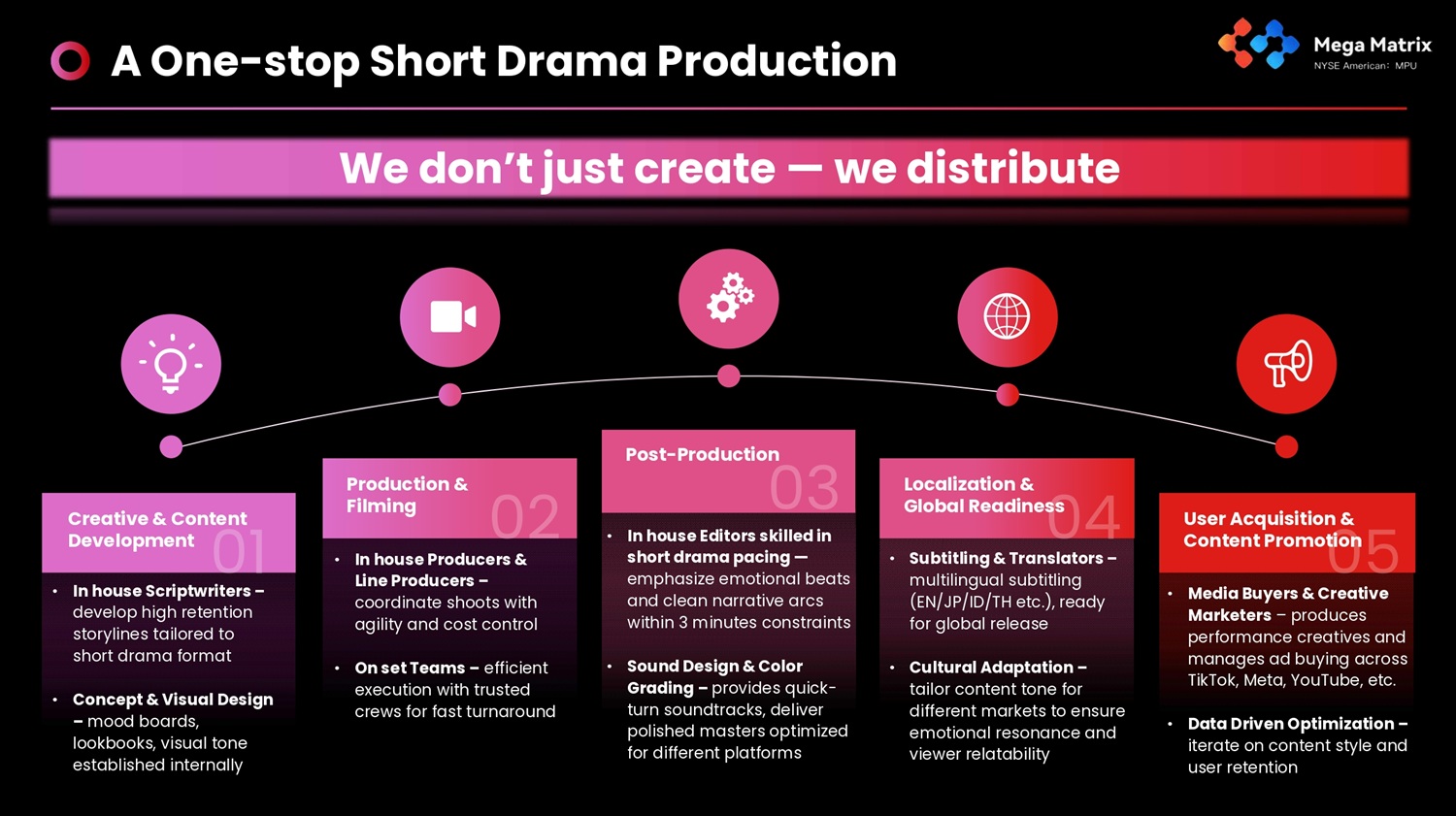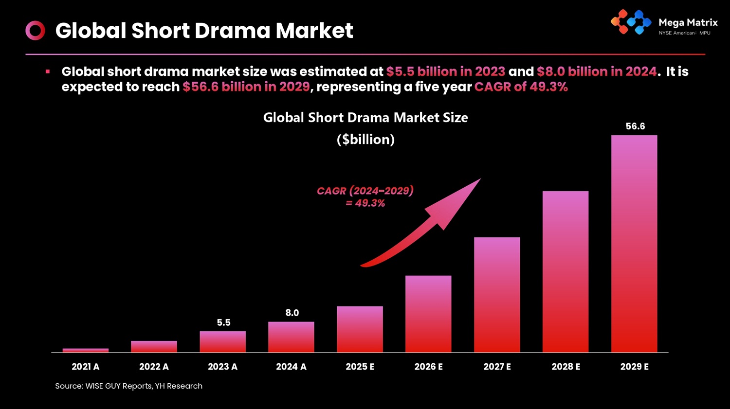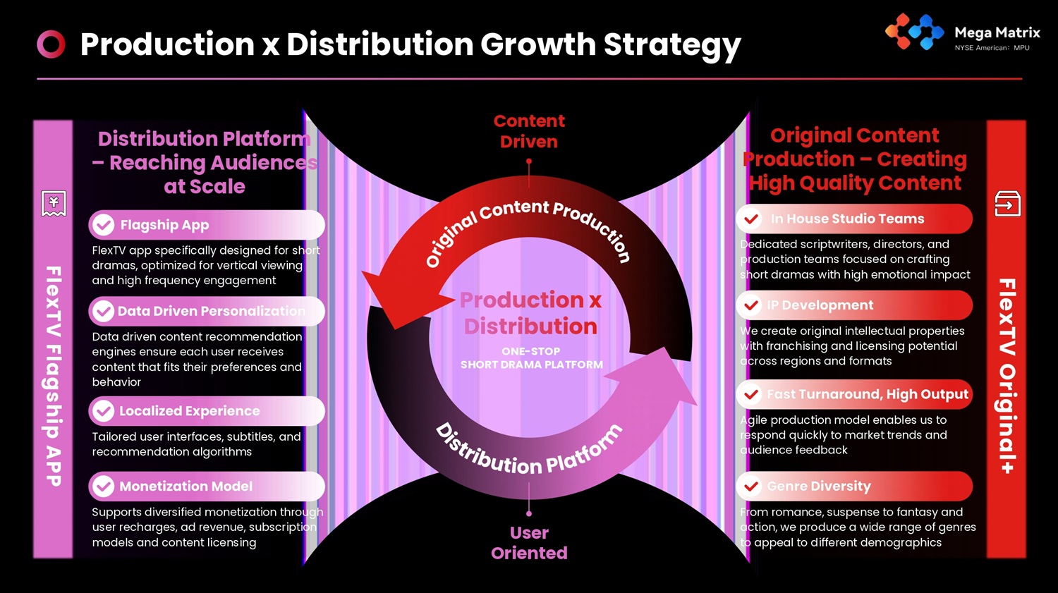 It is ▪ Global short drama market size was estimated at expected to reach , representing a five year FlexTV Overview FlexTV Home Page FlexTV Original+ FlexTV , the flagship product of Mega Matrix Inc. (NYSE American : MPU), is a global leader in short - form vertical drama technology . As the first short drama company publicly listed in the U . S . , MPU is advancing its growth through a dual - engine strategy of content production and global distribution, with the goal of building a full - stack content ecosystem encompassing original IP development, AI oriented efficient production, intelligent distribution, user acquisition, and IP commercialization . FlexTV features 7 , 600 + short - drama series and has produced 100 + original series , covering a wide range of high - demand genres and localized into 15 languages . Supported by robust in - house production capabilities, an efficient multi - language localization pipeline, and an expanding global distribution network, FlexTV reaches more than 10 million users across 100 + countries .