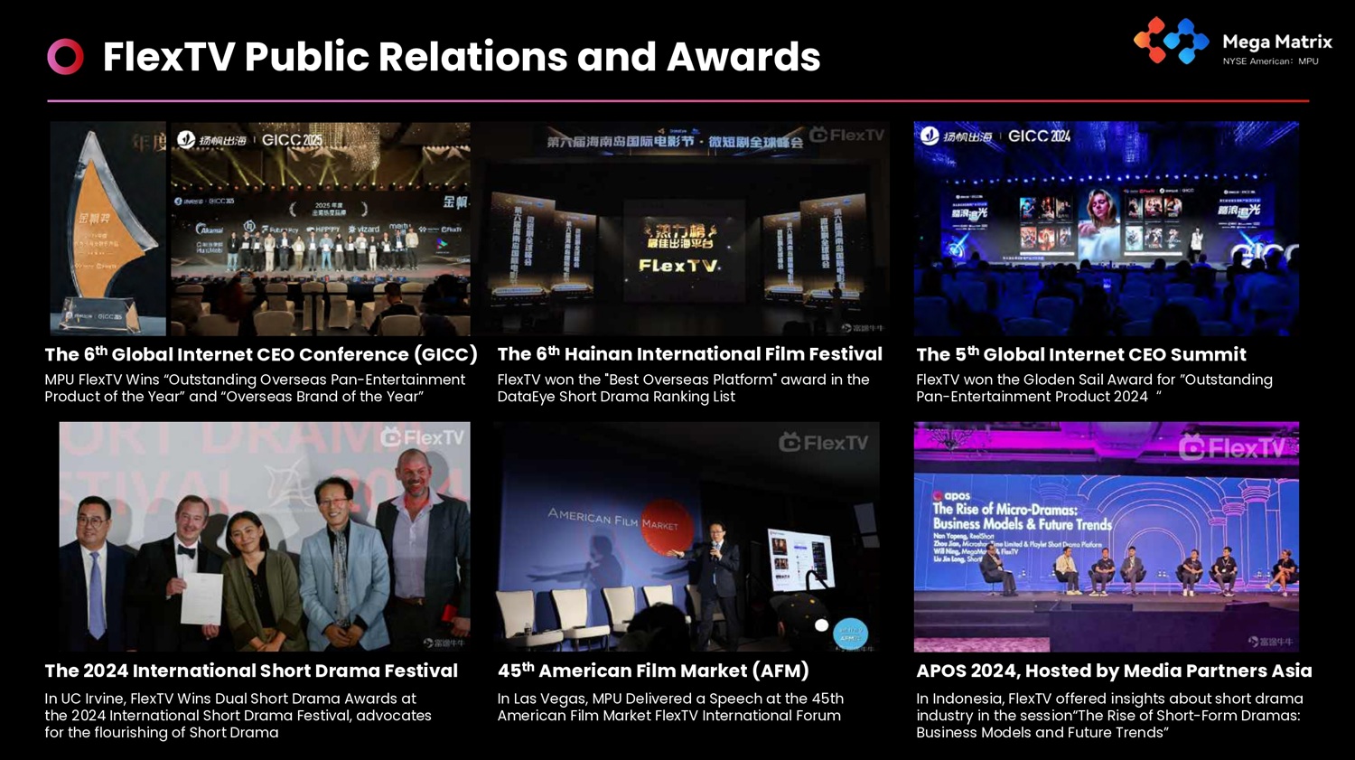 FlexTV Business Model z IAP Content Licensing IAA In - App Purchase ͣ IAP ͤ Subscription Episode Unlocking Pre - roll Ads Product Placement Banner Ads FlexTV Originals Remakes Rights Joint Premier In - App Advertising ͣ IAA ͤ Content Licensing FlexTV Public Relations and Awards The 6 th Global Internet CEO Conference (GICC) MPU FlexTV Wins “Outstanding Overseas Pan - Entertainment Product of the Year” and “Overseas Brand of the Year” The 5 th Global Internet CEO Summit FlexTV won the Gloden Sail Award for ”Outstanding Pan - Entertainment Product 2024 “ The 6 th Hainan International Film Festival FlexTV won the "Best Overseas Platform" award in the DataEye Short Drama Ranking List 45 th American Film Market (AFM) In Las Vegas, MPU Delivered a Speech at the 45th American Film Market FlexTV International Forum APOS 2024 , Hosted by Media Partners Asia In Indonesia, FlexTV offered insights about short drama industry in the session“The Rise of Short - Form Dramas : Business Models and Future Trends” The 2024 International Short Drama Festival In UC Irvine, FlexTV Wins Dual Short Drama Awards at the 2024 International Short Drama Festival, advocates for the flourishing of Short Drama To Develop Digital Asset Treasury Strategy on Stablecoin and Governance Token Pairs
