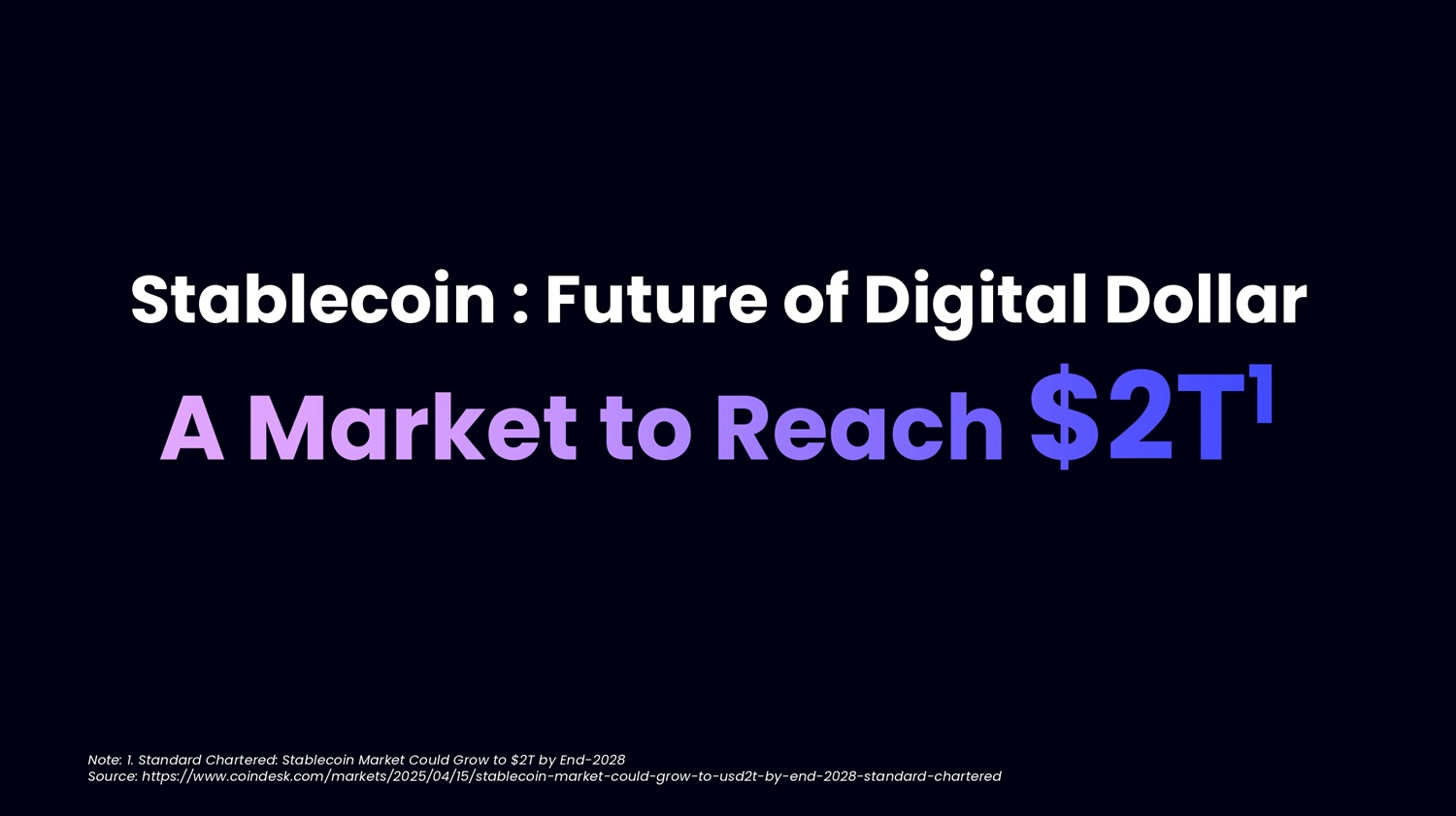 Note: 1. Standard Chartered: Stablecoin Market Could Grow to $2T by End - 2028 Source: https:// www.coindesk.com/markets/2025/04/15/stablecoin - market - could - grow - to - usd2t - by - end - 2028 - standard - chartered Stablecoin : Future of Digital Dollar Market Cap 1 Monthly Transfer Volume 2 Monthly Active Addresses 3 Number of Holders Mass Adoption in Stablecoin Note: 1.
