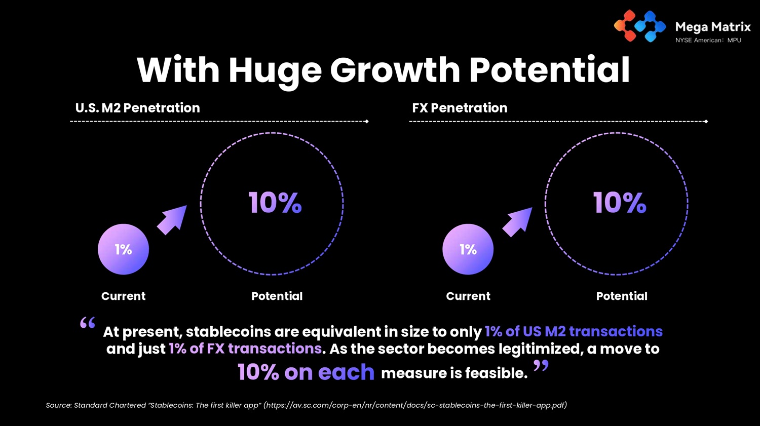 Number of on - chain addresses that have transferred a tracked stablecoin in the past 30 days of Nov 30 th , 2025 Source: https://app.rwa.xyz/stablecoins With Huge Growth Potential Source: Standard Chartered ”Stablecoins: The first killer app” (https://av.sc.com/corp - en/nr/content/docs/sc - stablecoins - the - first - killer - app.pdf) and just . As the sector becomes legitimized, a move to measure is feasible. Current Potential Current At present, stablecoins are equivalent in size to only 1% 1% Potential U.S. M2 Penetration FX Penetration Dual Engines for Stability & Growth
