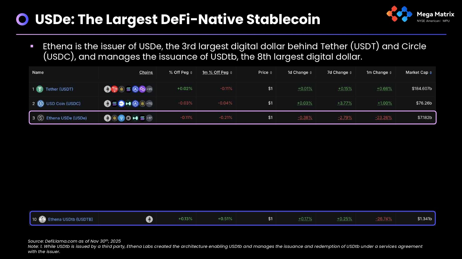 Source: DefiLlama.com as of Nov 30 th , 2025 Note: 1. While USDtb is issued by a third party, Ethena Labs created the architecture enabling USDtb and manages the issuance and redemption of USDtb under a services agreement with the issuer.