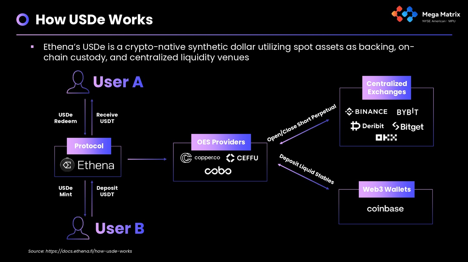 USDe: The Largest DeFi - Native Stablecoin - 3rd largest tokenized dollar asset - Offering relative stability to USD, without reliance on traditional banking - Peg stability supported via delta - neutral hedging of crypto assets - Revenue is generated from staking and funding rates - Collateral held in "Off - Exchange Settlement" solutions to minimize counterparty risk - 10th largest stablecoin - Backed by BlackRock’s USD Institutional Digital Liquidity Fund Token, BUIDL. - Seeks to maintain a USD peg through cash or cash - equivalent reserves, with 90% allocated to BUIDL for high stability and liquidity - Expected to be fully GENIUS Act compliant by Q4 2025 Tokenized Digital Dollar BUIDL - Backed Digital Dollar Source: https://docs.ethena.fi/how - usde - works; https://docs.ethena.fi/usdtb Ethena Stablecoins: USDe & USDtb Web3 Wallets ▪ Ethena’s USDe is a crypto - native synthetic dollar utilizing spot assets as backing, on - chain custody, and centralized liquidity venues Centralized Exchanges OES Providers USDe Redeem Receive USDT USDe Mint Deposit USDT Protocol Source: https://docs.ethena.fi/how - usde - works How USDe Works