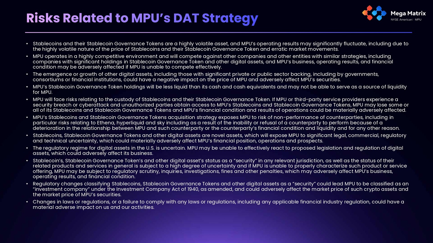 • Stablecoins and their Stablecoin Governance Tokens are a highly volatile asset, and MPU’s operating results may significantly fluctuate, including due to the highly volatile nature of the price of Stablecoins and their Stablecoin Governance Token and erratic market movements. • MPU operates in a highly competitive environment and will compete against other companies and other entities with similar strategies, including companies with significant holdings in Stablecoin Governance Token and other digital assets, and MPU’s business, operating results, and financial condition may be adversely affected if MPU is unable to compete effectively. • The emergence or growth of other digital assets, including those with significant private or public sector backing, including by governments, consortiums or financial institutions, could have a negative impact on the price of MPU and adversely affect MPU’s securities. • MPU’s Stablecoin Governance Token holdings will be less liquid than its cash and cash equivalents and may not be able to serve as a source of liquidity for MPU. • MPU will face risks relating to the custody of Stablecoins and their Stablecoin Governance Token. If MPU or third - party service providers experience a security breach or cyberattack and unauthorized parties obtain access to MPU’s Stablecoins and Stablecoin Governance Tokens, MPU may lose some or all of its Stablecoins and Stablecoin Governance Tokens and MPU’s financial condition and results of operations could be materially adversely affected. • MPU’s Stablecoins and Stablecoin Governance Tokens acquisition strategy exposes MPU to risk of non - performance of counterparties, including in particular risks relating to Ethena, hyperliquid and sky including as a result of the inability or refusal of a counterparty to perform because of a deterioration in the relationship between MPU and such counterparty or the counterparty’s financial condition and liquidity and for any other reason. • Stablecoins, Stablecoin Governance Tokens and other digital assets are novel assets, which will expose MPU to significant legal, commercial, regulatory and technical uncertainty, which could materially adversely affect MPU’s financial position, operations and prospects. • The regulatory regime for digital assets in the U.S. is uncertain. MPU may be unable to effectively react to proposed legislation and regulation of digital assets, which could adversely affect its business. • Stablecoin’s, Stablecoin Governance Token’s and other digital asset’s status as a “security” in any relevant jurisdiction, as well as the status of their related products and services in general is subject to a high degree of uncertainty and if MPU is unable to properly characterize such product or service offering, MPU may be subject to regulatory scrutiny, inquiries, investigations, fines and other penalties, which may adversely affect MPU’s business, operating results, and financial condition. • Regulatory changes classifying Stablecoins, Stablecoin Governance Tokens and other digital assets as a “security” could lead MPU to be classified as an “investment company” under the Investment Company Act of 1940 , as amended, and could adversely affect the market price of such crypto assets and the market price of MPU’s securities . • Changes in laws or regulations, or a failure to comply with any laws or regulations, including any applicable financial industry regulation, could have a material adverse impact on us and our activities .
