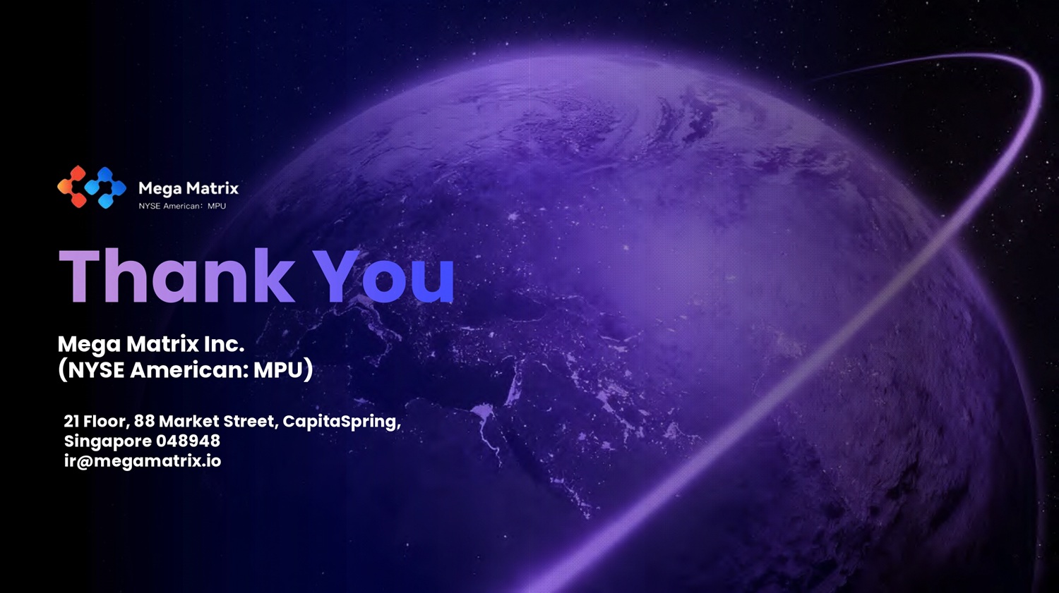 Mega Matrix Inc. (NYSE American: MPU) 21 Floor, 88 Market Street, CapitaSpring, Singapore 048948 ir@megamatrix.io