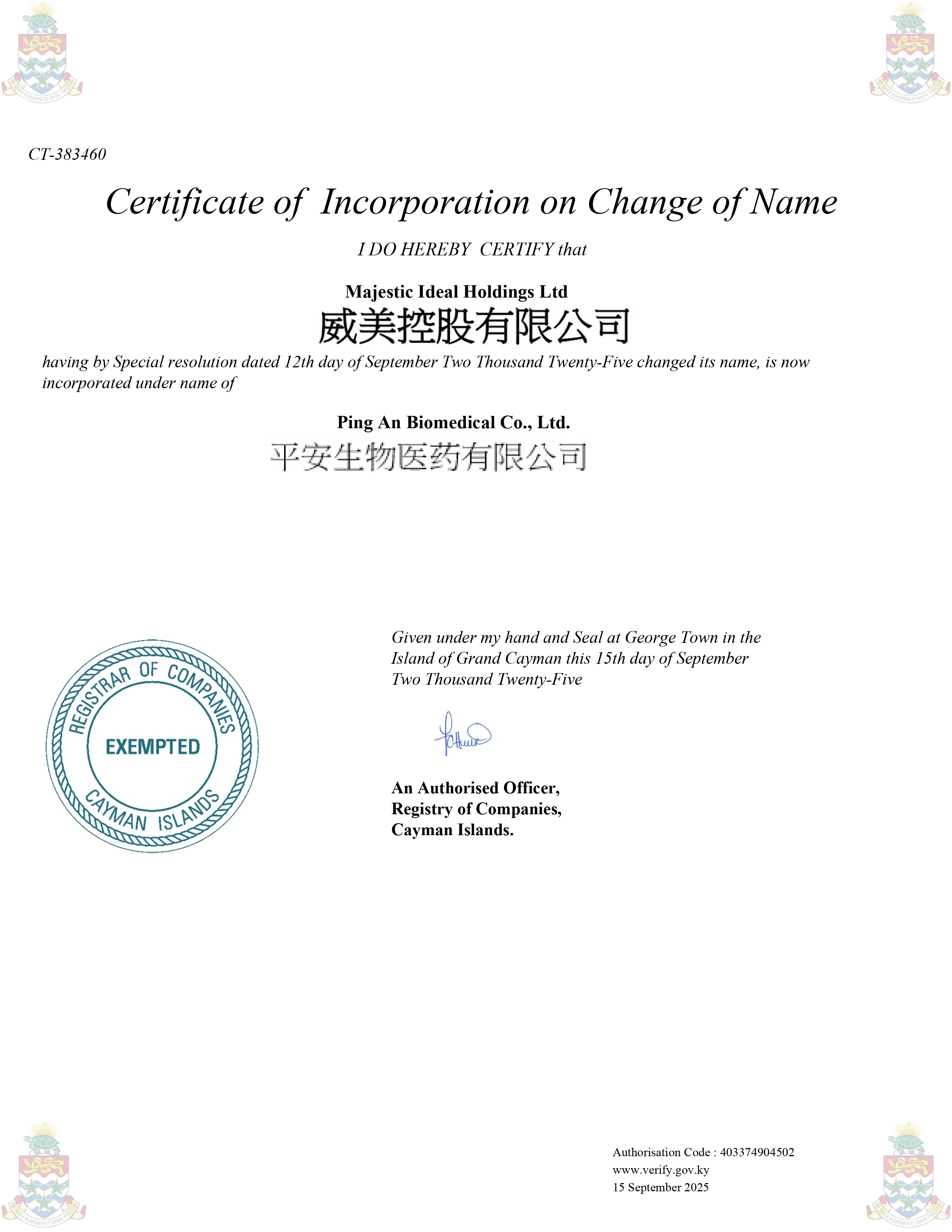 Authorisation Code : 403374904502 www.verify.gov.ky 15 September 2025 CT - 383460 Certificate of Incorporation on Change of Name Given under my hand and Seal at George Town in the Island of Grand Cayman this 15th day of September Two Thousand Twenty - Five An Authorised Officer, Registry of Companies, Cayman Islands . I DO HEREBY CERTIFY that Majestic Ideal Holdings Ltd having by Special resolution dated 12th day of September Two Thousand Twenty - Five changed its name, is now incorporated under name of Ping An Biomedical Co., Ltd.