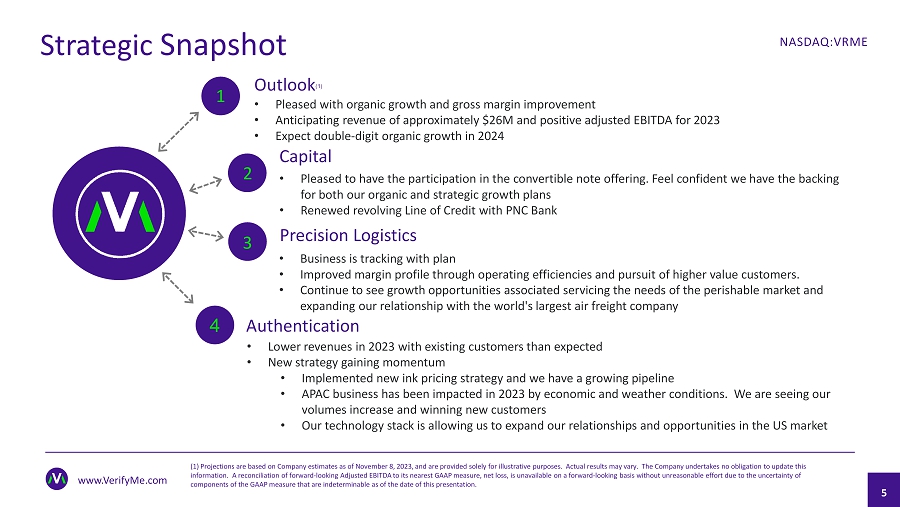 Outlook (1) 1 • Pleased with organic growth and gross margin improvement • Anticipating revenue of approximately $26M and positive adjusted EBITDA for 2023 • Expect double - digit organic growth in 2024 Capital • Pleased to have the participation in the convertible note offering. Feel confident we have the backing for both our organic and strategic growth plans • Renewed revolving Line of Credit with PNC Bank Precision Logistics • Business is tracking with plan • Improved margin profile through operating efficiencies and pursuit of higher value customers. • Continue to see growth opportunities associated servicing the needs of the perishable market and expanding our relationship with the world's largest air freight company 3 2 Strategic Snapshot 5 www.VerifyMe.com NASDAQ:VRME 4 Authentication • Lower revenues in 2023 with existing customers than expected • New strategy gaining momentum • Implemented new ink pricing strategy and we have a growing pipeline • APAC business has been impacted in 2023 by economic and weather conditions. We are seeing our volumes increase and winning new customers • Our technology stack is allowing us to expand our relationships and opportunities in the US market (1) Projections are based on Company estimates as of November 8 , 2023, and are provided solely for illustrative purposes. Actual results may vary. The Company undertakes no obligation to up date this information. A reconciliation of forward - looking Adjusted EBITDA to its nearest GAAP measure, net loss, is unavailable on a forward - looking basis without unreaso nable effort due to the uncertainty of components of the GAAP measure that are indeterminable as of the date of this presentation.