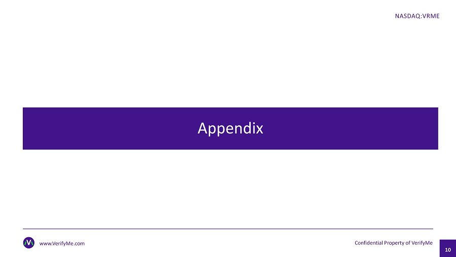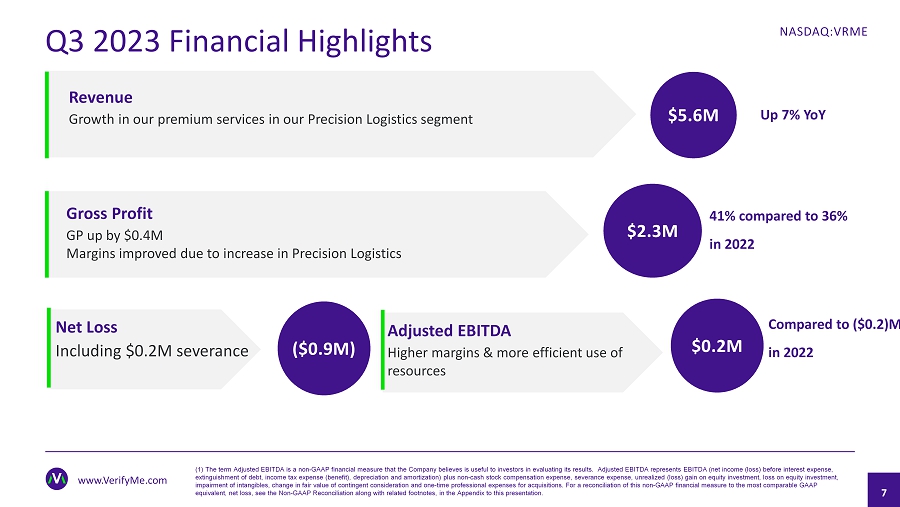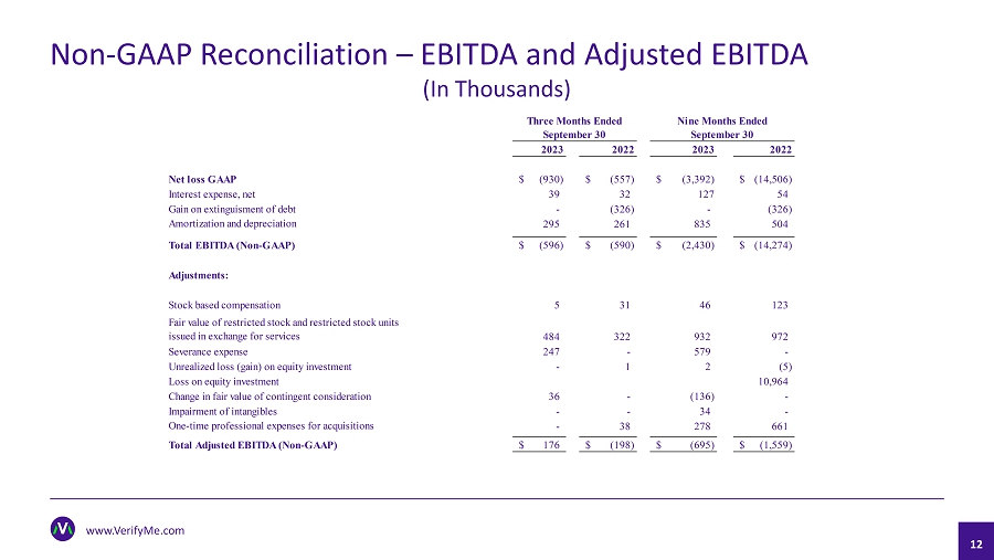 当社はEBITDAを、支払利息、債務償還、法人税等(利益)、減価償却費および償却費控除前の純利益(損失)と定義している。調整後EBITDAは、EBITDAに現金支出を伴わない株式報酬費用、退職費用、株式投資の未実現(損失)利得、株式投資の損失、無形資産の減損、偶発対価の公正価値の変動、買収のための一時的な専門的費用を加えたものです。VerifyMeは、EBITDAと調整後EBITDAは、経営陣、投資家、アナリストが、比較可能性に影響を与える非営業的な項目の影響を取り除いた後、期間ごとのVerifyMeの中核的な営業成績を評価し、評価することを可能にするため、VerifyMeの営業成績を示す重要な指標であると考えています。